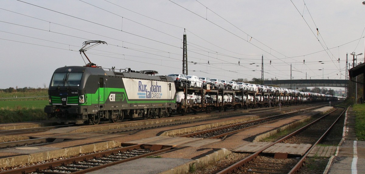 Der Vectron 193 832-3 von ELOC (european locomotive leasing) vermietet an die Rurtalbahn Cargo ist am 27.11.2014 mit einem vollen Autotransportzug durch Kirchstetten unterwegs. Der Zug fährt Richtung Passau. Julien Seeling