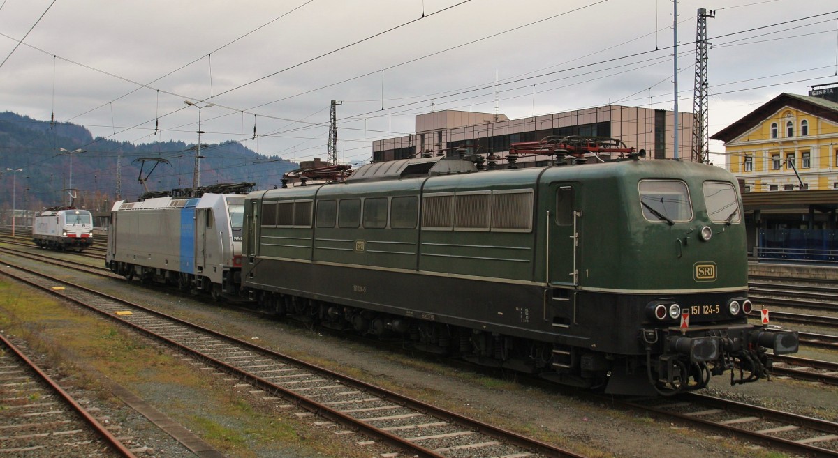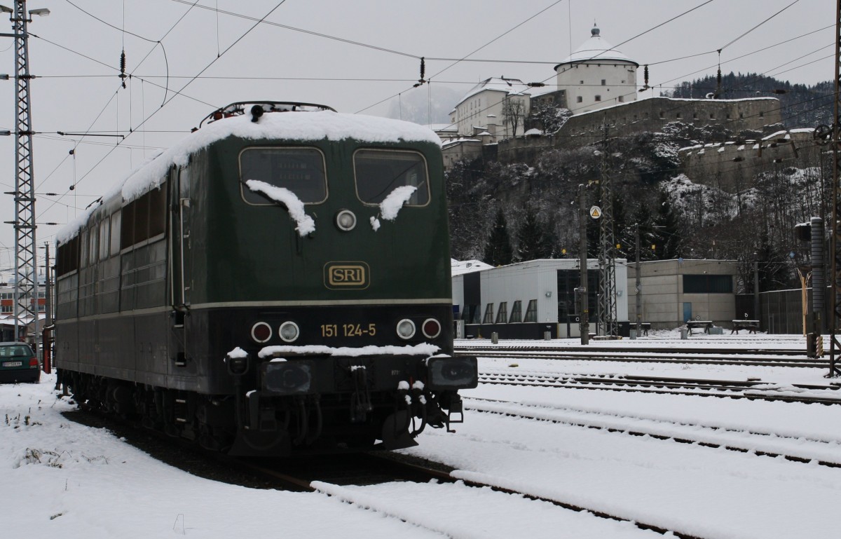 Die 151 124-5 der SRI steht am 11.12.2014 zusammen mit 186 290-3 von Lokomotion im Bahnhof Kufstein. Die Lok wurde von Lokomotion noch bis Anfang Januar 2015 angemietet und wird als Schublok bis zum Brenner eingesetzt. Wenige Minuten nach der Aufnahme ist der Zug als LZ nach München gefahren. Julien Seeling