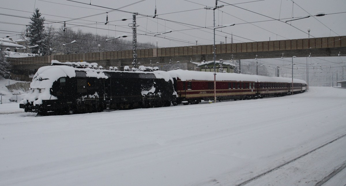 Die 182 582-7 der Cargo Serv steht am Abend des 10.1.2015 mit einem Teil des Schneeexpress nach Hamburg im Bahnhof Wörgl. Der Sonderzug kam von Mallnitz-Obervellach und ist bis Wörgl von der BR 182 gezogen wurden. Die Lok verkehrt über die Giselabahn als LZ zurück auf die Tauernstrecke. Den Zugteil nach Hamburg übernimmt die 185 691-3 von Railpool. Julien Seeling