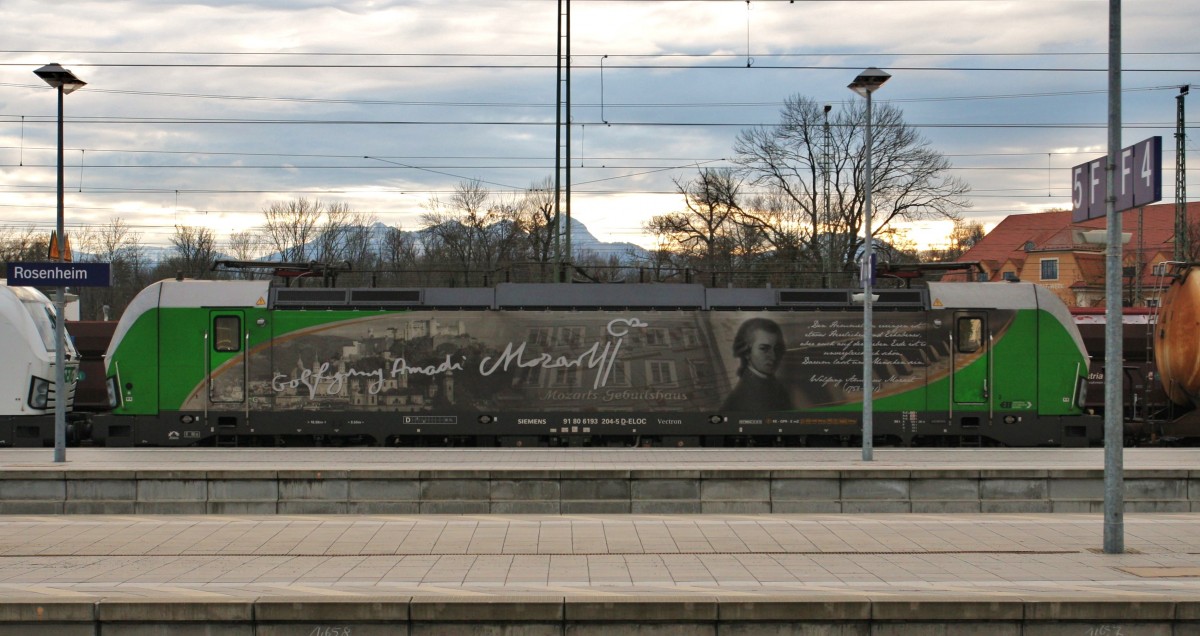 193 204-5 SETG mit der Werbung ``Wolfgang Amadi Mozart`` steht am 15.12.2015 mit einem Kesselzug im Bahnhof Rosenheim. Grund für den Stop ist die Überholung des Rheingoldexpresses nach Salzburg. Julien Seeling