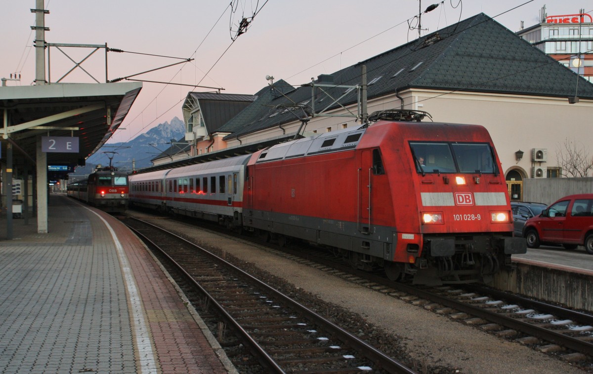 Der jeden Samstag im Winter verkehrende IC von München Hbf nach Schwarzach st.Veit steht am 26.12.2015 im Bahnhof Wörgl. Gezogen von der 101 028-9 ändert er in Wörgl seine Fahrtrichtung und wird von einer 1116 der ÖBB über die Giselabahn gezogen. Die 101 028-9 verbleibt über Nacht in Wörgl. Julien Seeling