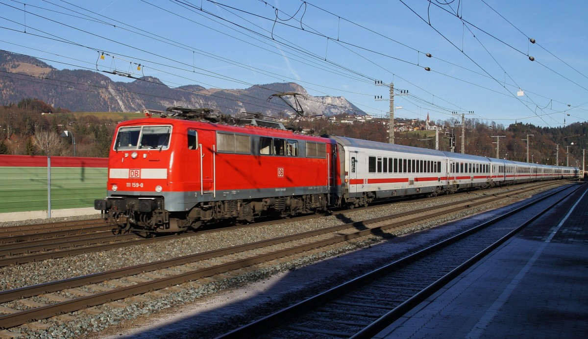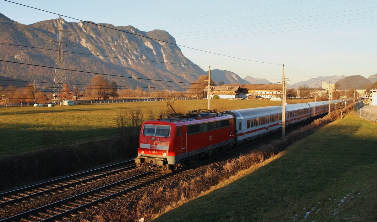 Die Münchener 111 159-0 schiebt am Samstag Nachmittag des 26.12.2015 den IC 1282 von Innsbruck kommend nach München Hbf. Hier kurz vor Sonnenuntergang bei Kirchbichl Richtung Kufstein. Julien Seeling