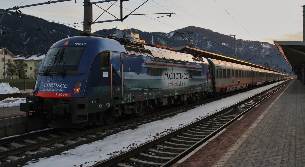 Die neueste Werbelok der ÖBB steht am Nachmittag des 6.2.2016 mit dem EC 84 von Bologna nach München in Wörgl. Es ist die 1216 019-0 "Achensee- Tirol Schiffahrt.at" Julien Seeling