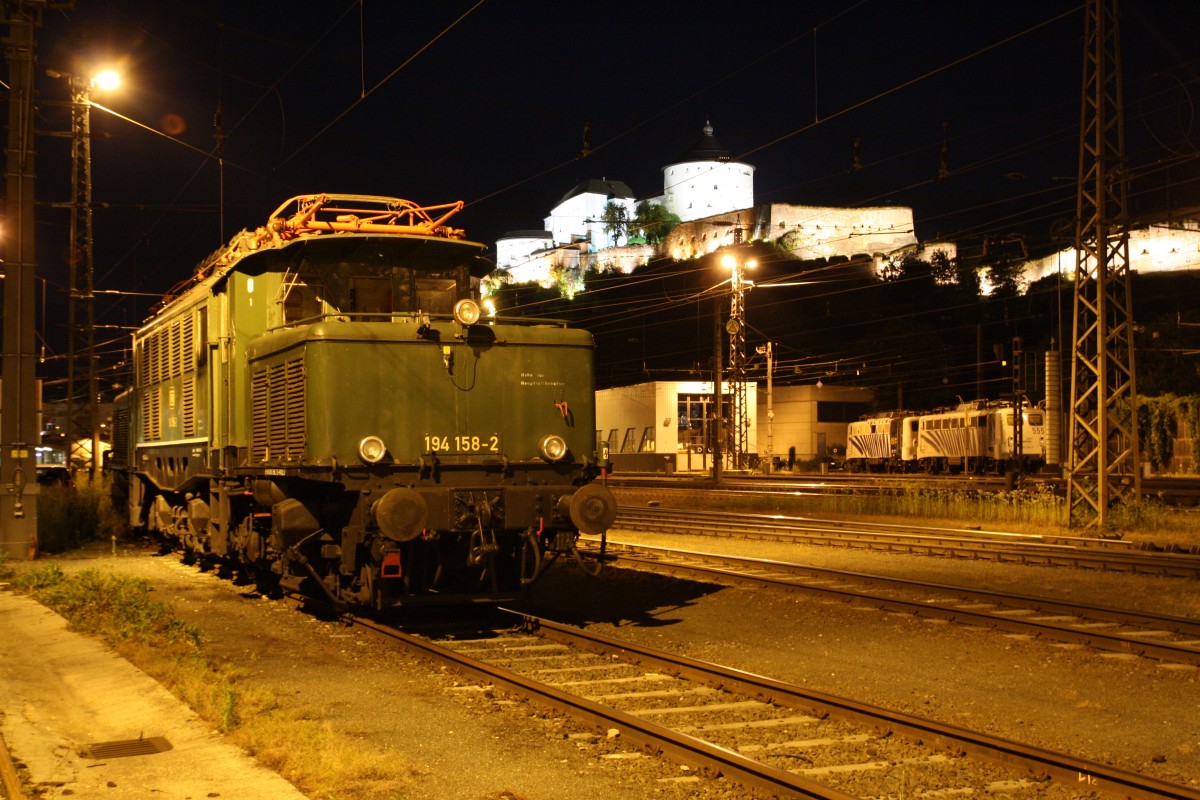 Am Späten Abend des 18.6.2014 steht 194 158-2 von Rail4U abgestellt im Bahnhof Kufstein. Im Hintergrund stehen noch 2 Loks der BR 139 von Lokomotion. Julien Seeling