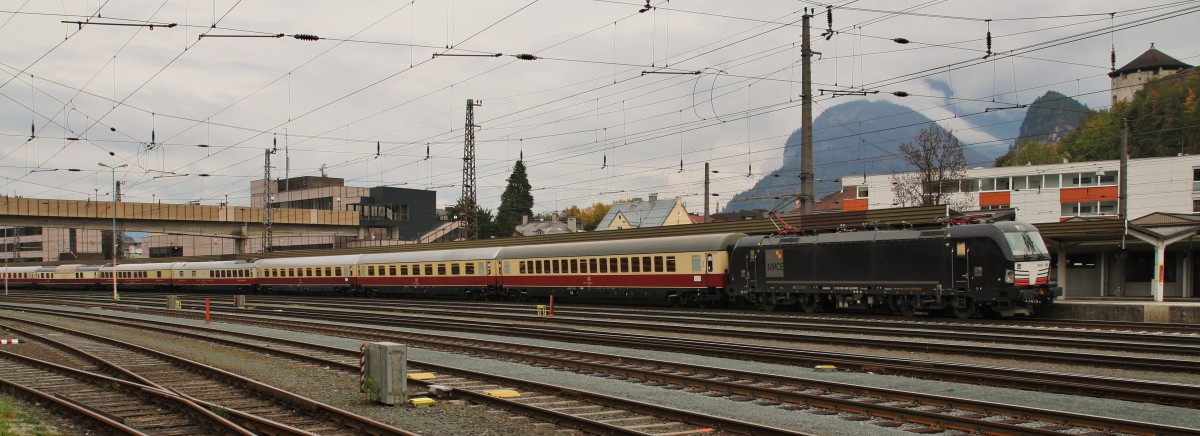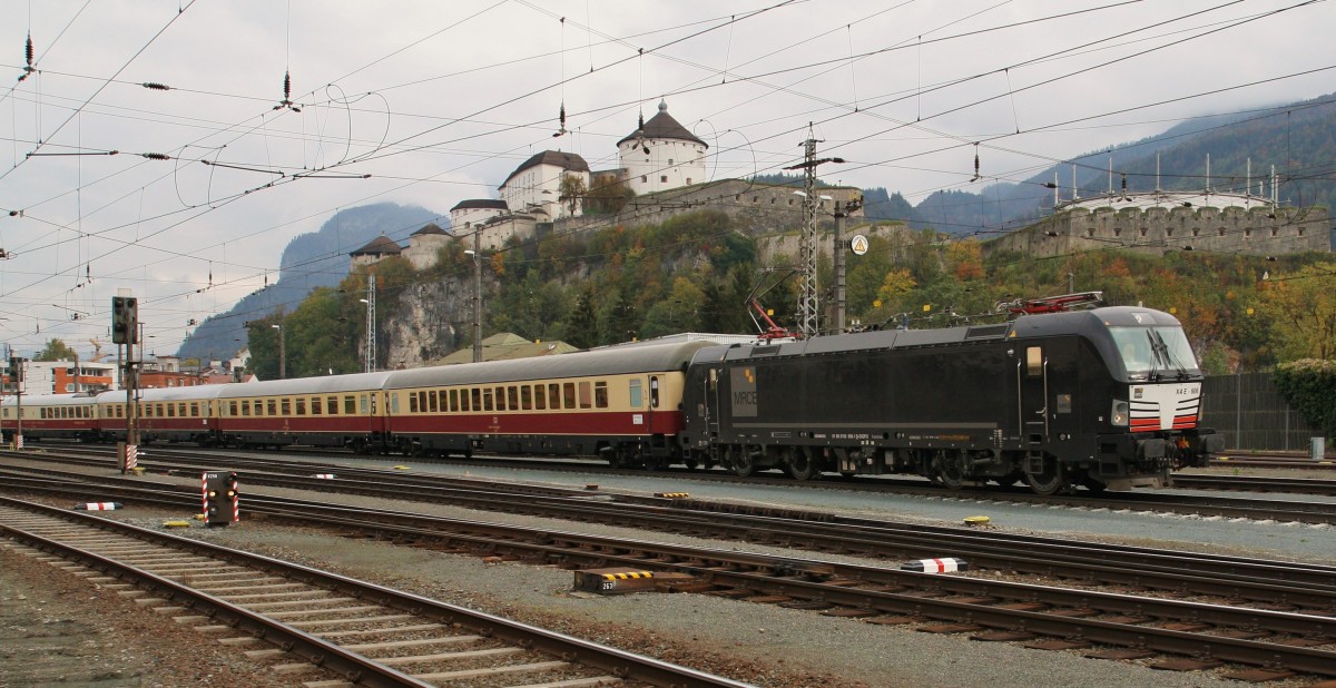 Am 18.10.2015 ist 193 606-1 von MRCE mit dem Rheingold Express (SE 20040/DBS 99) von Berlin nach Italien zum Gardasee unterwegs. Auf Grund der Flüchtlingskrise endet der Zug dieses Jahr bereits am Brenner und die Fahrgäste werden mit Bussen nach Südtirol gebracht. Hier am Sonntag Nachmittag bei der Ausfahrt in Kufstein mit Blick auf die Festung. Grüße an den TF!