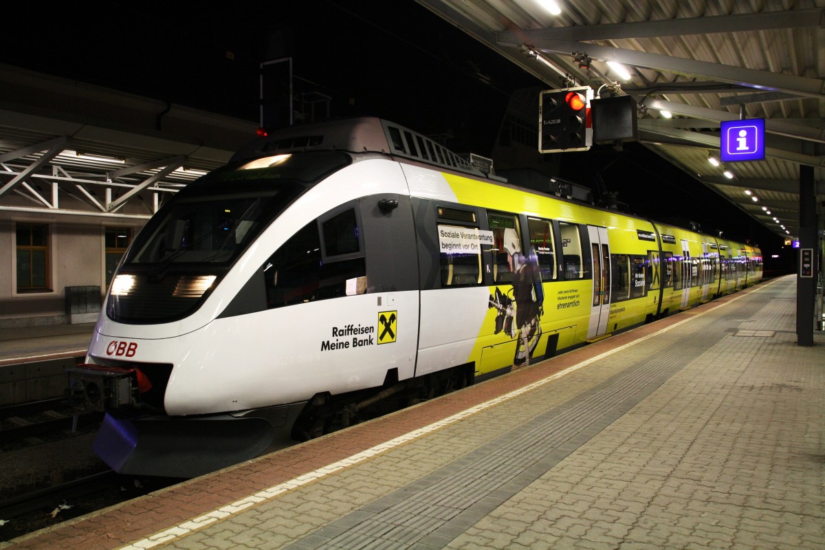 Der neue Werbe-Talent 4024 088-9  Raiffeisen, meine Bank  (Ex Tiroler Versicherung) macht Werbung für die Raiffeisen Clubmitglieder. Hier wartet der Talent als S-Bahn nach Saalfelden im Bahnhof Wörgl. 19.9.2015