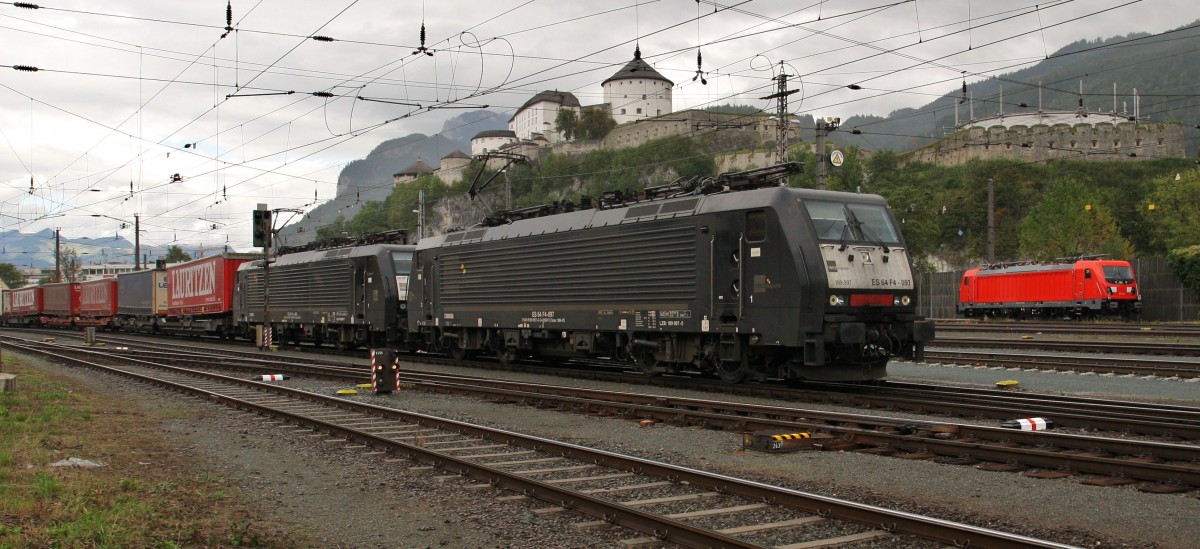 Die 189 997-0 und 189 908-7 von TXL verlassen am Nachmittag des 20.9.2015 mit einem KLV den Bahnhof Kufstein auf dem Weg nach Italien. Rechts im Bild steht die neue 187 010-7 BTK.