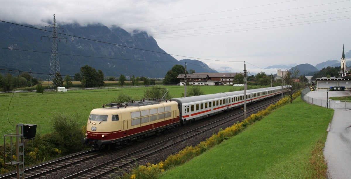Wie jeden Samstag im Sommer kommt pünktlich um 16.32 die 103 245-7 mit dem IC  Großglockner  aus München nach Schwarzach St. Veit in Kirchbichl durchgefahren. Die Lok verbleibt in Wörgl und fährt Sonntag Mittag wieder nach München. Hier kurz vor Wörgl am 5.9.2015