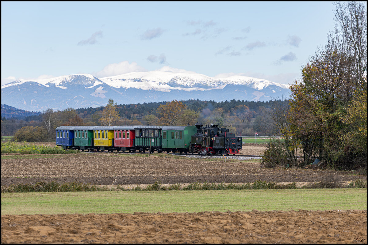 Den ersten "Richtigen " Schnee haben die Berge in der Nacht auf denn 24.Oktober 2025 bekommen . Durchs Stainztal dampft der Flascherlzug . Karl Heinz Ferk