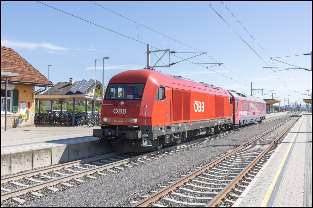 16ter April 2025 . 2016.076 verlässt den Bahnhof Wies Eibiswald unter dem thronenden Schloss Burgstall zu Wies . Am Haken den "Railchecker" der den Fahrweg der Steirischen Westbahn auf Herz und Nieren geprüft hat .