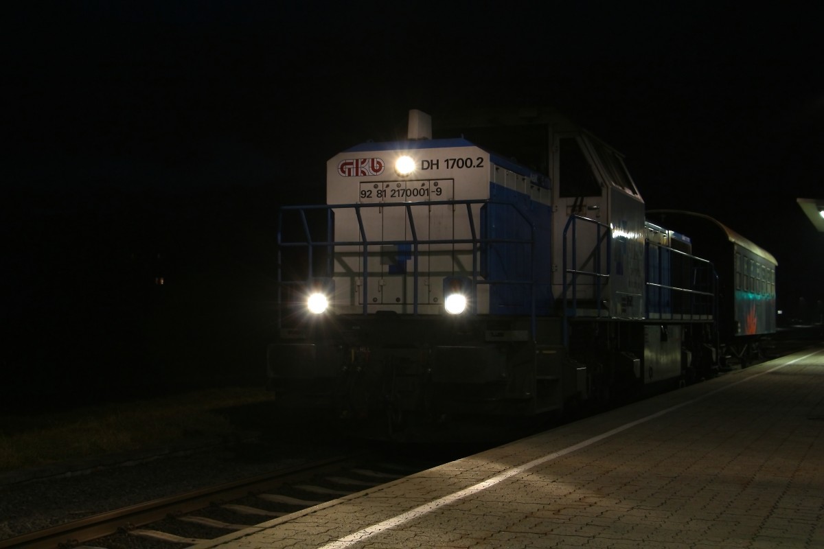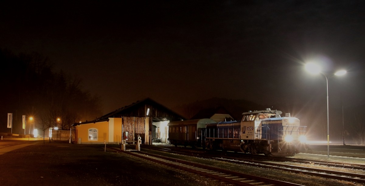 Eine kleine Gruppe von Modellbahnbegeisterten haben in Deutschlandsberg seit einigen Jahrzenten mehrere 2 Achsige Personenwagen in denen sich Modelleisenbahnen und Werkstädten dafür befinden. Jährlich um die Weihnachtszeit gibt es die Modelleisenbahnen zu bewundern. Aktuell ist es zwar nur die Originalnachbildung des Bahnhofes Lieboch die zu sehen ist , an der  größeren  Vorführanlage wird allerdings auf Hochdruck gearbeitet! Da die Wagen allesamt im freien stehen und die Witterung der Farbsubstanz natürlich zusetzt wurden alle Wagen ins Heizhaus nach Wies Eibiswald überstellt. Hier der letzte Wagen aus Deutschlandsberg (BI18) bei der Überstellfahrt am späten NAchmittag des 11.Januar 2013 gezogen von GKB DH1700.2