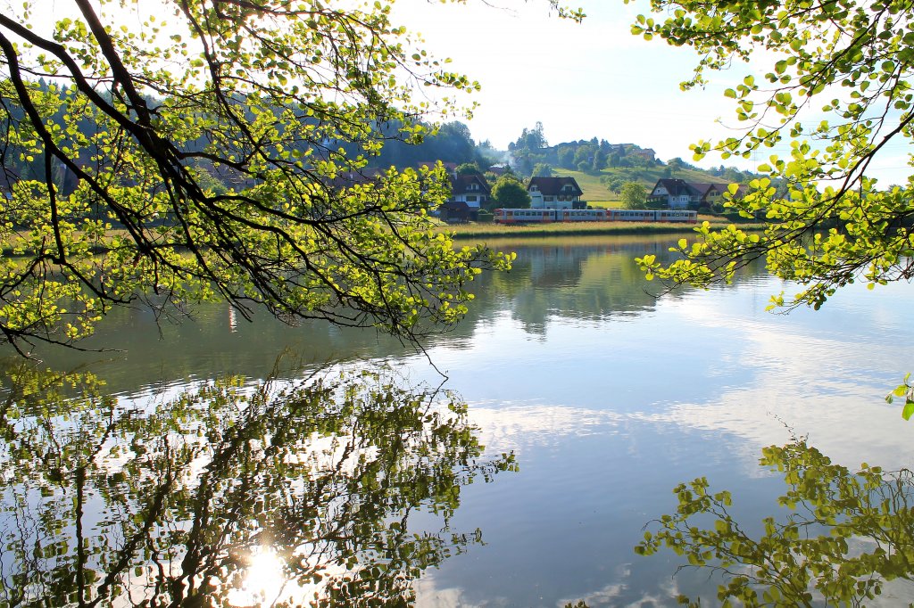Morgens gibt es derzeit noc ein  Veteranentreffen  im Bahnhof Deutschlandsberg. R8556 gebildet aus 2 VT70 und R8553 bestehend aus einem Doppelstock -Steuerwagen , einem Mittelwagen und einem Tfz der Reihe 1500 der hier den Anstieg zur Leibenfelder Höhe hinter sich hat und entlang der Kres-Teiche nach Hollenegg rollt. 29.Mai2013