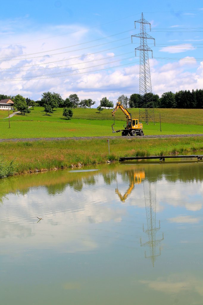 Im Zuge von Kabeltrog-verlegearbeiten kommt zwischen den Haltestellen Schwanberg ,Hollenegg und der Awanst Leibenfeld nachwievor ein 2-Wege bagger zum Einsatz. Hier zu sehen bei den Kres-Teichen am 5.Juni 2013