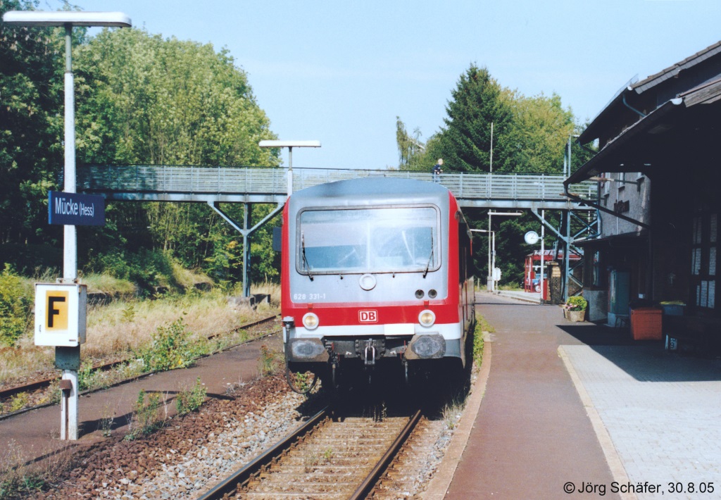 928 331 fährt am 30.8.05 als RB nach Lauterbach im ehemaligen Bahnhof Zell-Romrod ab. Das verwahrloste Empfangsgebäude ließ die Deutsche Bahn AG etwa 5 Jahre später abreißen. Jörg Schäfer