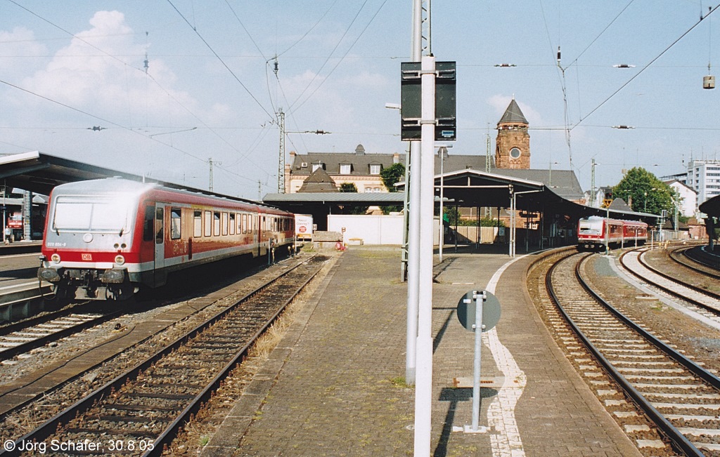 Blick nach Süden auf Nidda am 30.8.05: 218 269 steht mit ihrem Wendezug neben HLB 127 (ganz rechts) und zwei weiteren GTW 2/6 der Hessischen Landesbahn.