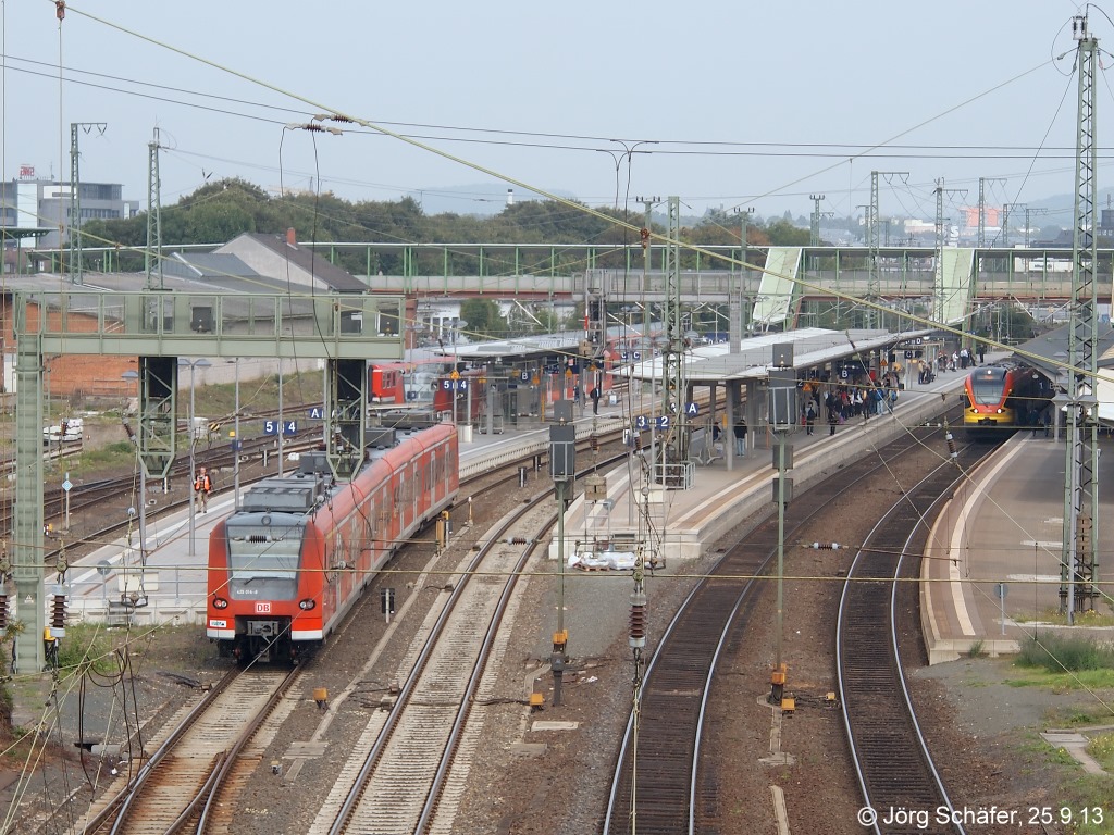 Blick von der Brücke über den Gießener Hbf auf die Gleise nach Fulda und Nidda am 25.9.13. In der Mitte fährt 508 106 nach Gelnhausen ab. Jörg Schäfer