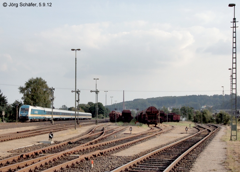 „Nachschuss“ auf 612 508 vor der östlichen Ausfahrsignalgruppe von Luitpoldhütte. Seit 2005 ist das Stellwerk am anderen Bahnhofsende nur noch wenige Stunden am Vormittag besetzt. (5.9.12) Jörg Schäfer