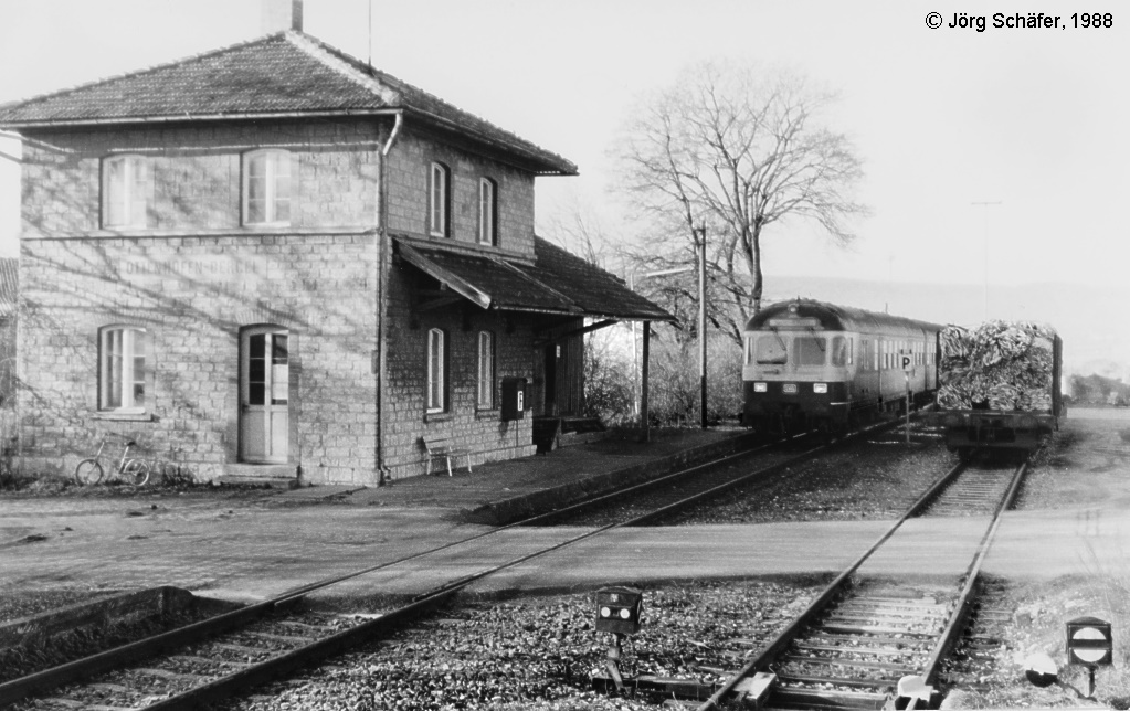 1988 war Ottenhofen-Bergel noch ein richtiger Bahnhof mit Ladegleis und Güterverkehr. Blick nach Westen auf einen Nahverkehrszug nach Neustadt/Aisch. Jörg Schäfer