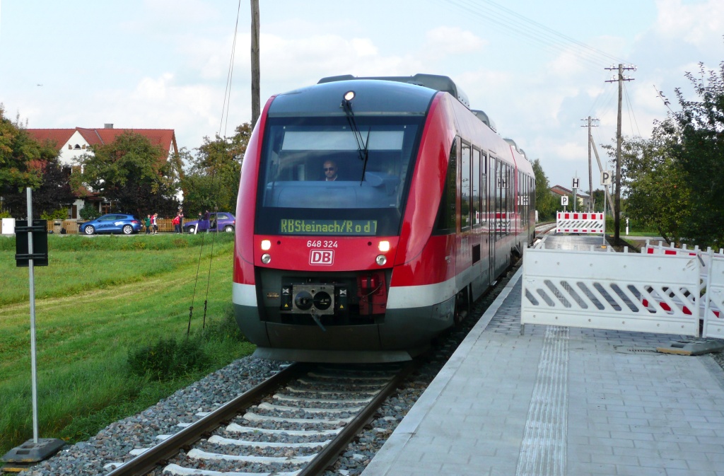 648 324 kommt am 29.9.10 als RB von Neustadt/Aisch in Burgbernheim an. Der neue Bahnsteig ist schon fast fertig und der Schilderwald für den Bahnübergang verschwunden. Jörg Schäfer