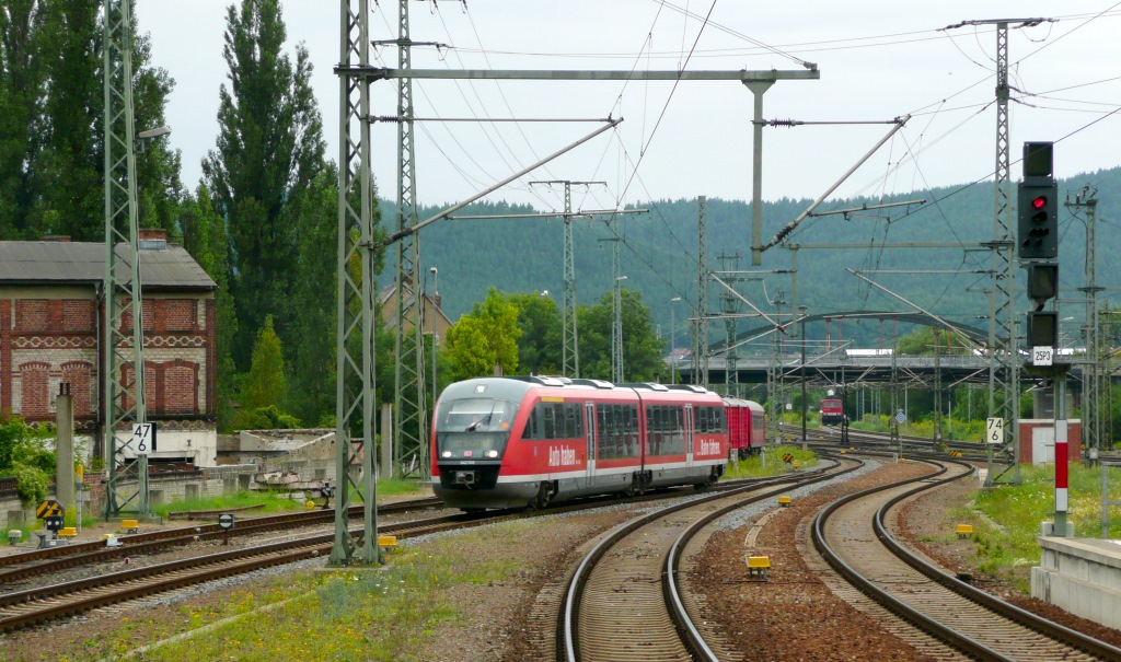 Ein „Desiro“ der Baureihe 642 kommt am 3.8.11 aus Erfurt in Saalfeld an. Im Hintergrund sieht man die Straßenbrücke, die schon vielen Fotografen als Standpunkt für Bilder vom Bw Saalfeld diente. Jörg Schäfer