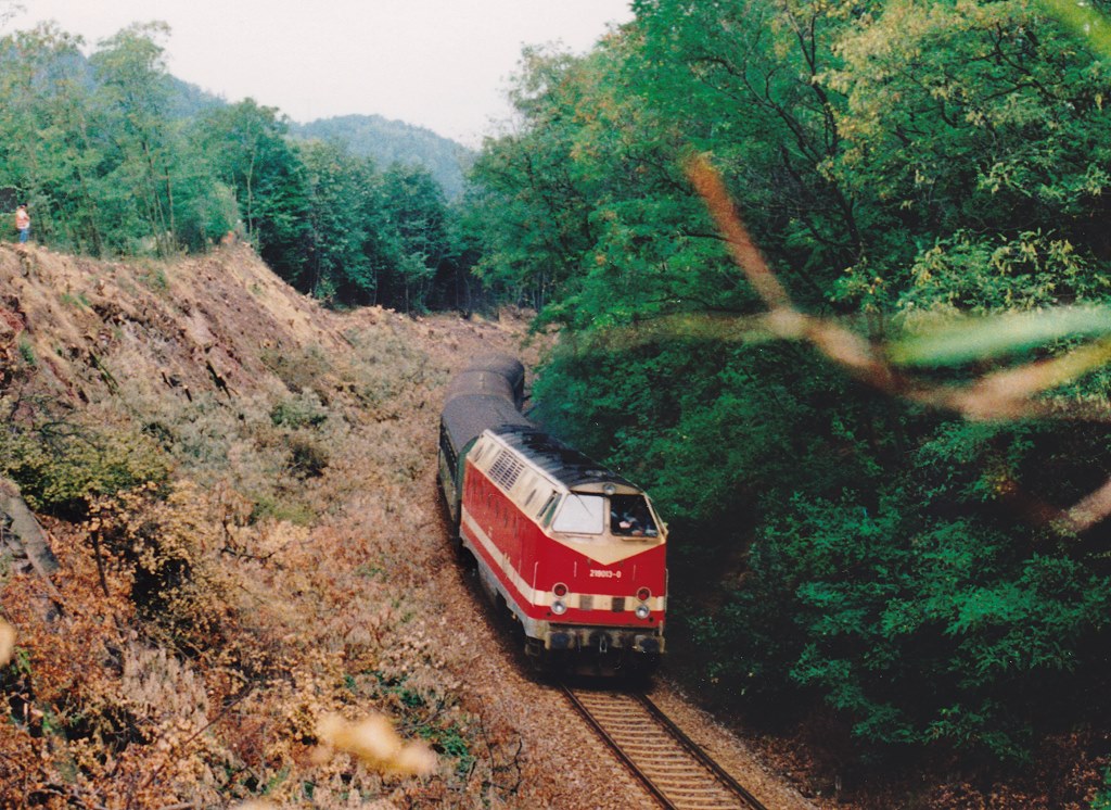 Im Einschnitt südlich von Reschwitz waren am 20.8.92 schon deutliche Spuren vom bevorstehenden Wiederaufbau des zweiten Gleises zu sehen. 219 013 fuhr mit einem Personenzug Richtung Probstzella durch. Jörg Schäfer