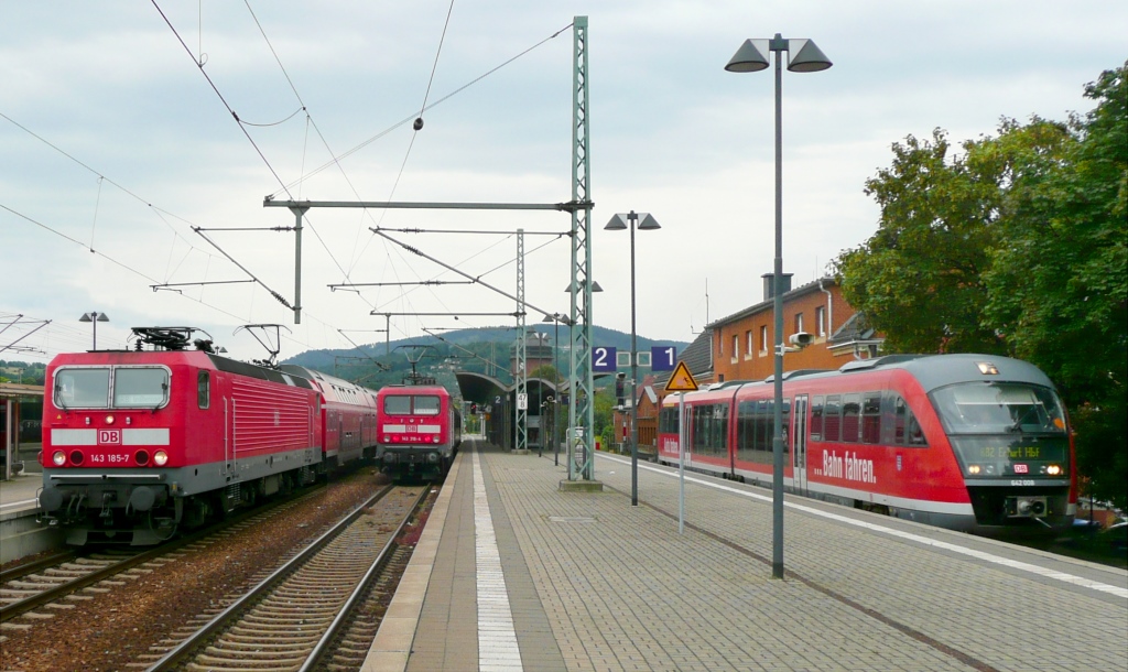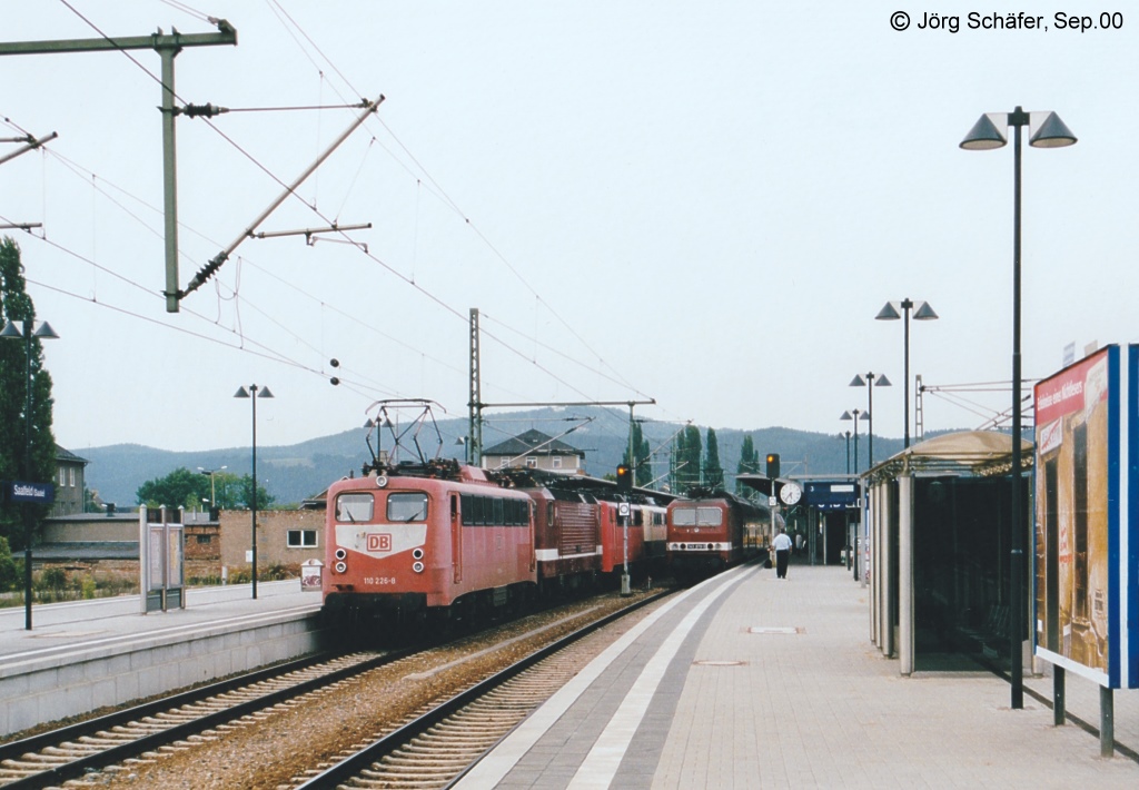 Im September 2000 standen 110 226 mit einem Lokzug und ihre ehemalige „Reichsbahn-Kollegin“ 143 679 mit einem Doppelstockzug in Saalfeld am Bahnsteig. Jörg Schäfer