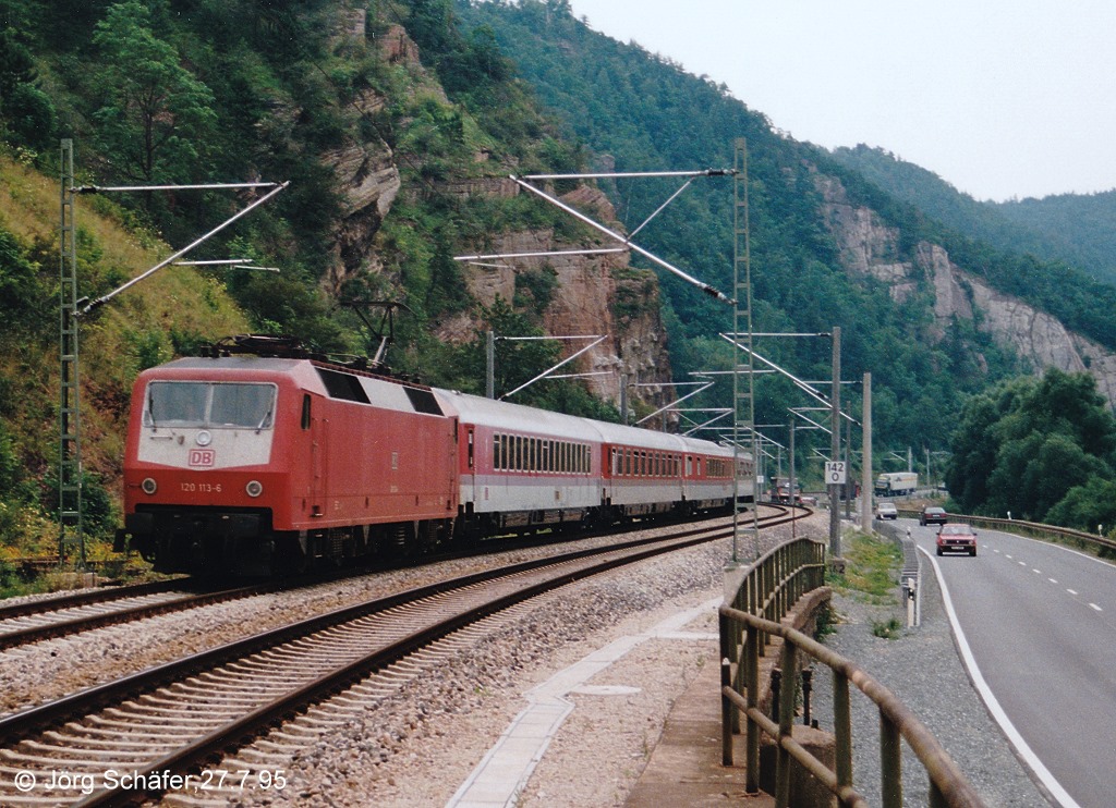 Südlich von Saalfeld wurden Bahnlinie und Bundesstraße nach der "Wende" umfassend ausgebaut. Als 120 113 mit ihrem IC nach Berlin am 27.7.95 an der "Bohlenwand" vorbei fuhr, hatte die Strecke schon wieder zwei Gleise und eine Oberleitung. Jörg Schäfer