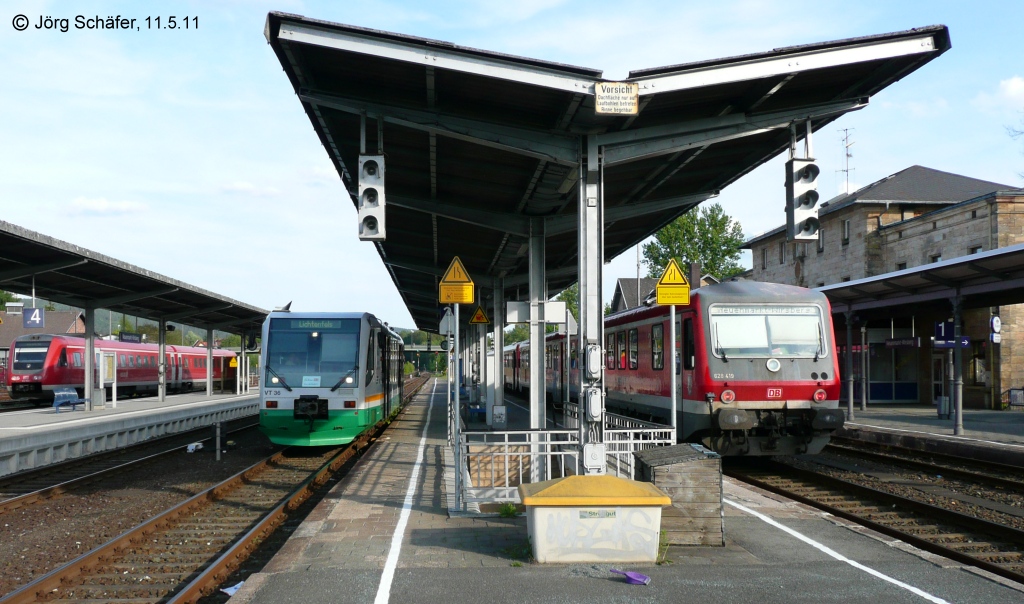 Vogtland-VT 36 und 628 419 warten am 11.5.11 in Neuenmarkt-Wirsberg auf den Taktknoten um 18.30 Uhr. 612 653 am linken Bildrand wird heute nicht mehr ins Geschehen eingreifen. Jörg Schäfer