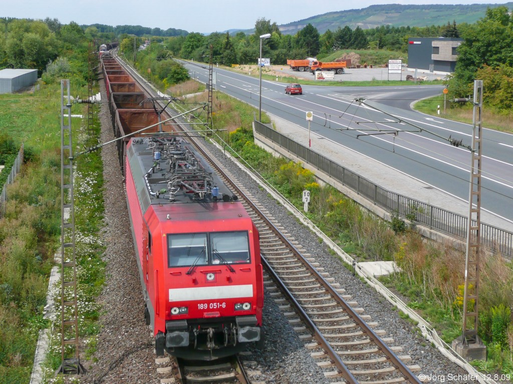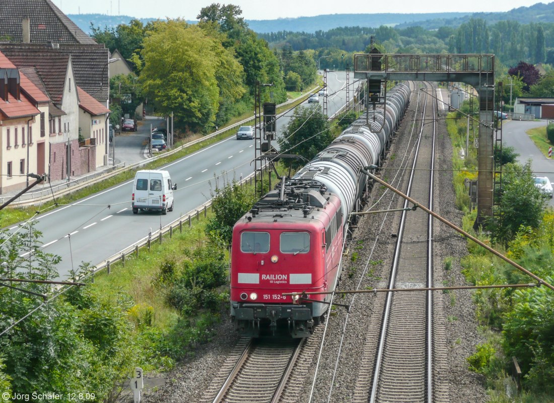 151 152 zog am 12.8.09 einen Güterzug unter der Thüngersheimer Signalbrücke hindurch. Links die Bundesstraße B8, rechts vom Bildrand fließt der Main. Jörg Schäfer