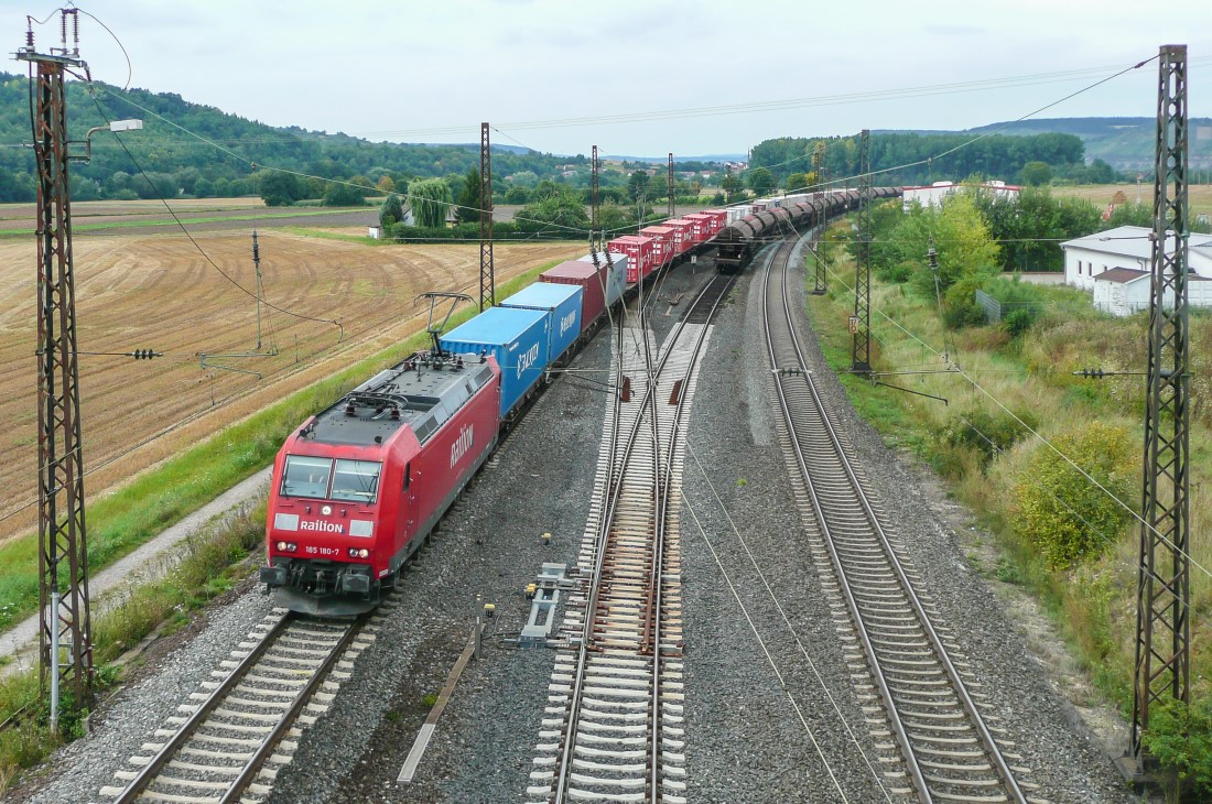 185 180 begegnete am 12.8.09 mit einem Güterzug Richtung Würzburg vor Retzbach-Zellingen einem Güterzug in der Gegenrichtung. Das mittige Überholungsgleis mündet mit einer Y-Weiche in die Streckengleise. Jörg Schäfer