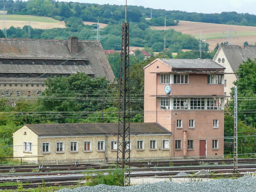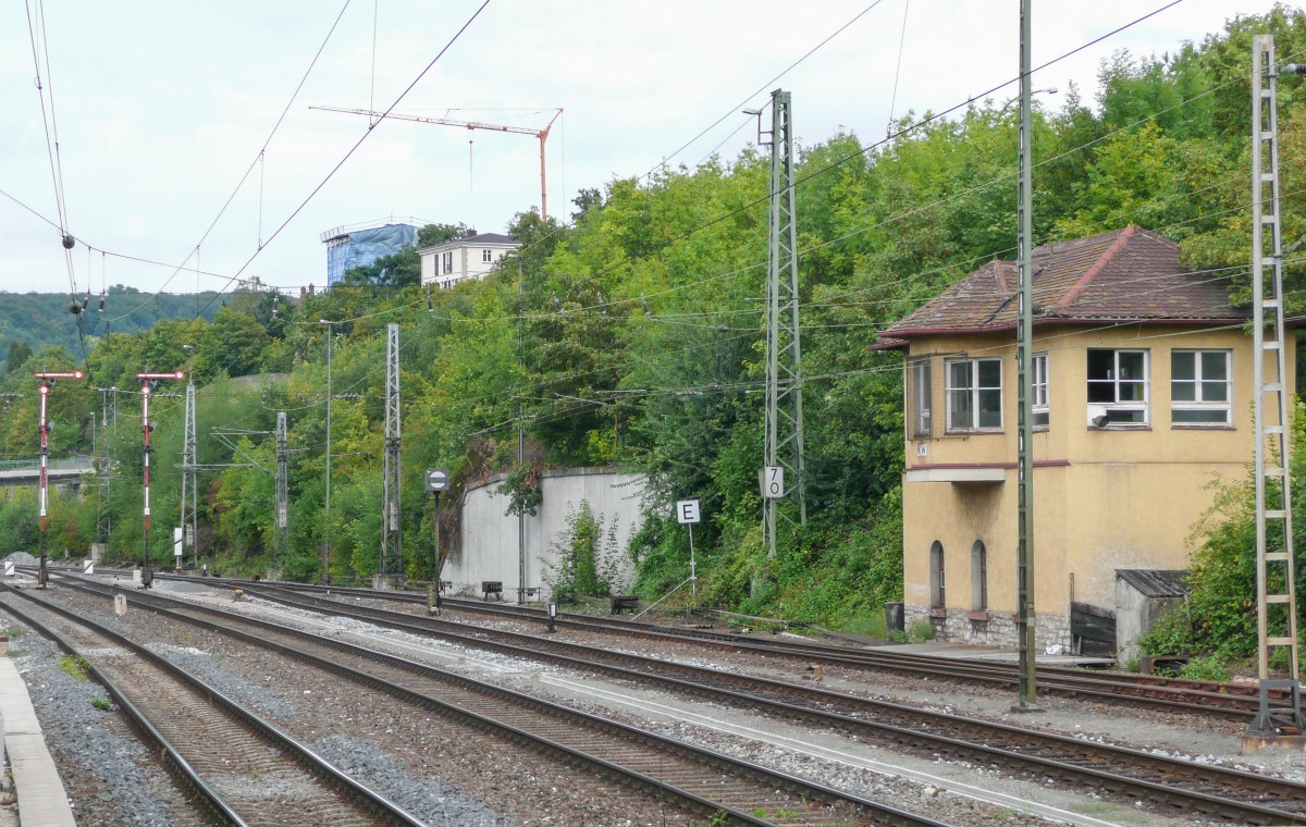 Anschlussbild zu ID 1011259, links vom Bildrand liegt der "Königsbahnhof" Veitshöchheim. Gegenüber steht das Stellwerk für die Weichen und Signale der vom Rangierbahnhof Würzburg-Zell einmündenden Gleise. (Blick nach Norden am 12.8.09) Jörg Schäfer
