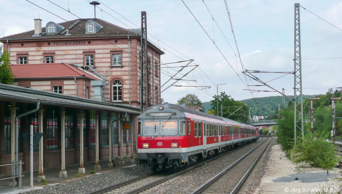 Der Bahnhof Veitshöchheim wurde in der Nähe einer königlichen Sommerresidenz mit Rokokogarten errichtet. Er bekam ein besonders repräsentatives Empfangsgebäude, das bis heute überdimensioniert wirkt. Die Bahnsteige wurden 2005 nach Süden verschoben, daher rollte die RB am 12.8.09 am "Königsbahnhof" vorbei. Jörg Schäfer