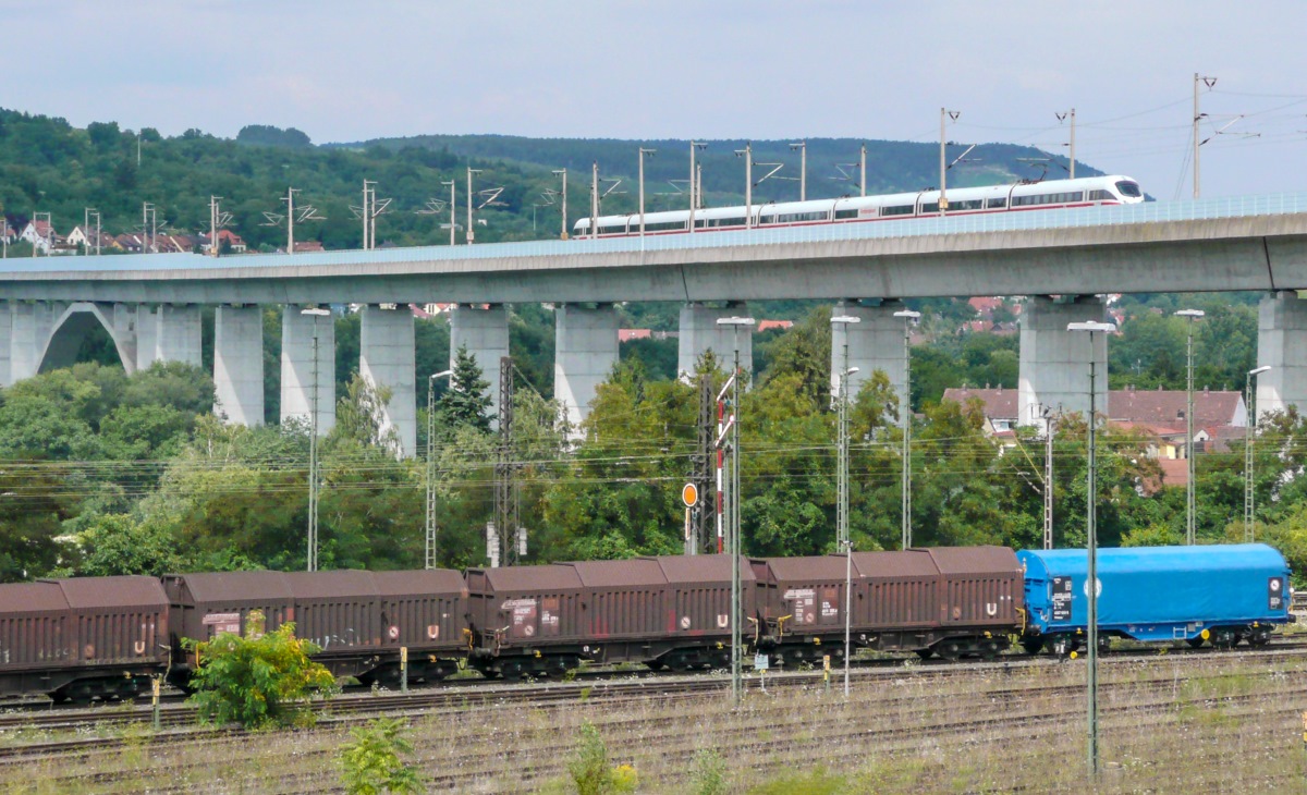 Ein ICE am 12.8.09 auf der 1.280 Meter langen Maintalbrücke bei km 322 der Schnellfahrstrecke Hannover-Würzburg. Vorne abgestellte Güterwagen im Rangierbahnhof Würzburg-Zell. Jörg Schäfer