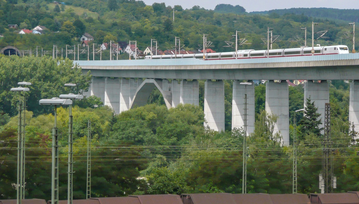 Ein ICE auf der Maintalbrücke beim Kilometerschild 322,0 der Schnellfahrstrecke Hannover-Würzburg. Links das Portal des Neubergtunnels und unten die Dächer der Güterwagen im Rangierbahnhof Würzburg-Zell. Jörg Schäfer