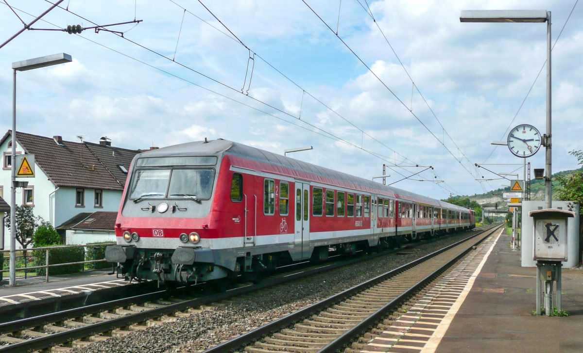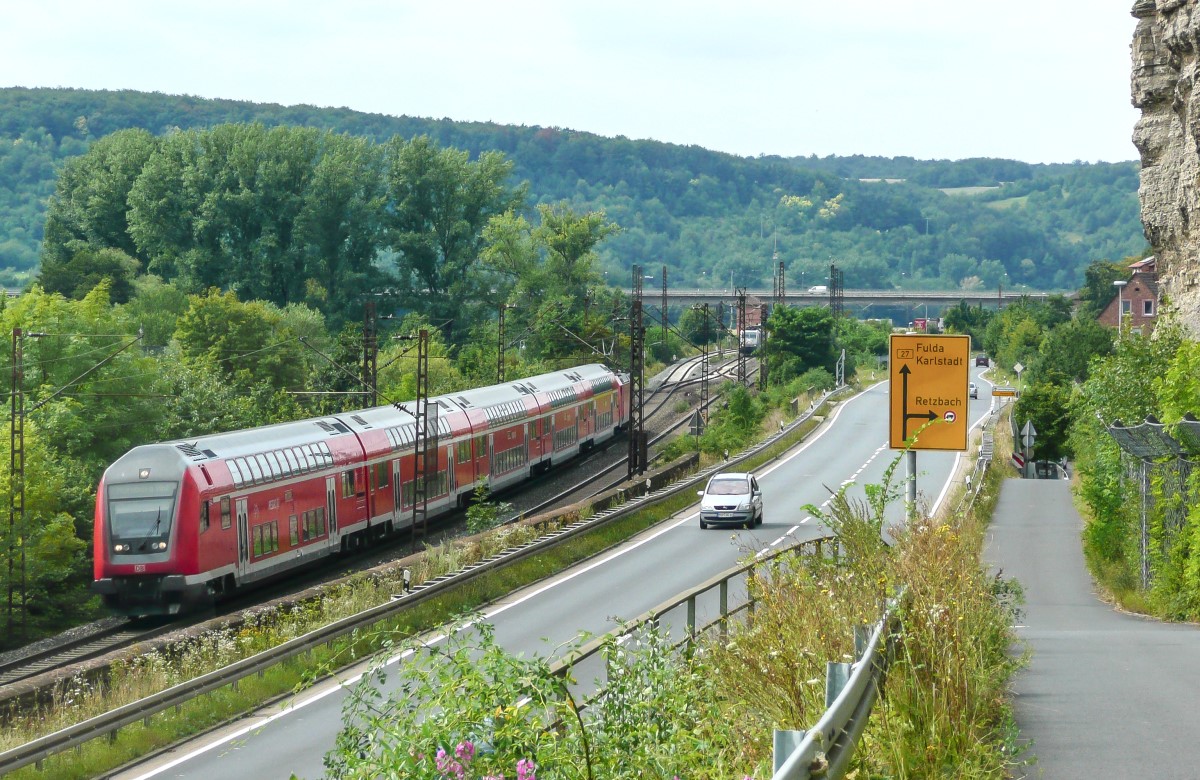 Ein RE nach Bamberg fuhr am 12.8.09 in Retzbach-Zellingen los. Im Hintergrund sieht man 185 531, die mit einem Güterzug auf Gleis 2 überholt wurde. Jörg Schäfer