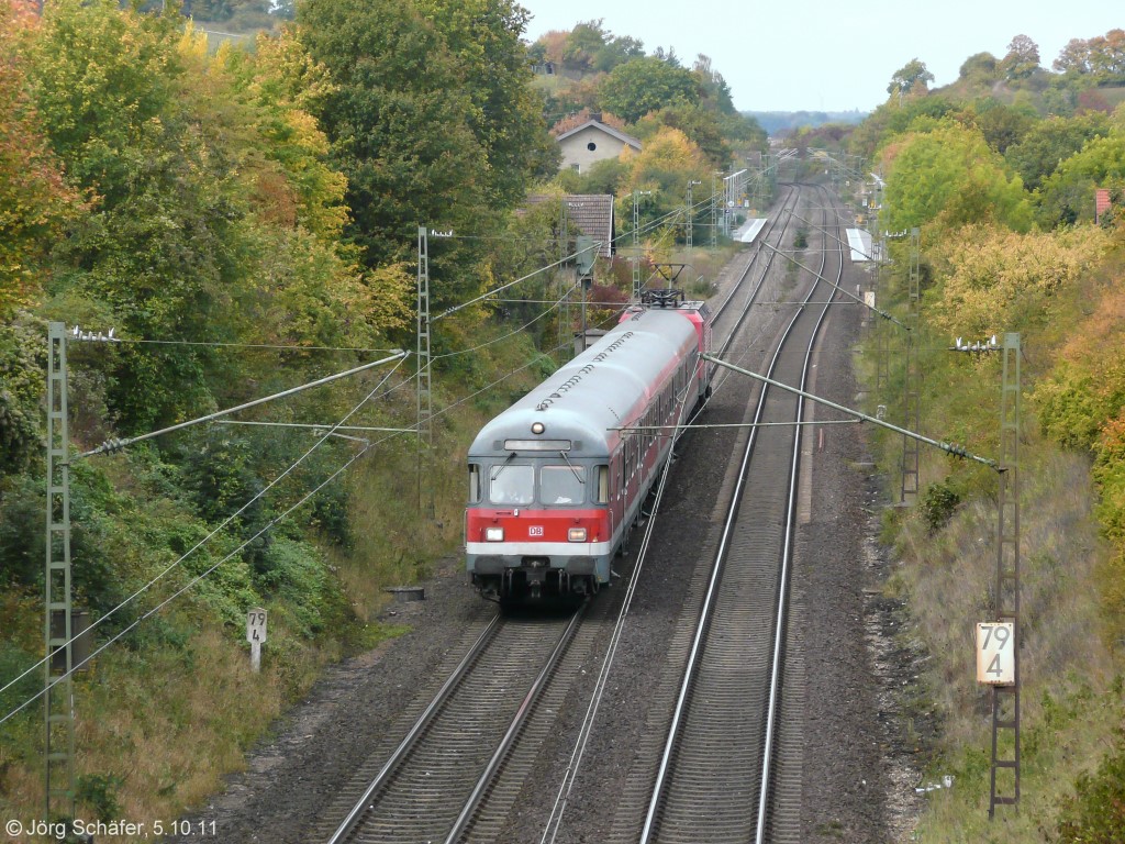 Als 143 895 mit ihrer RB nach Würzburg durch Burgbernheim-Wildbad raste, war der Bahnof schon 26 Jahre geschlossen. Kaum Jemand glaubte am 1.10.04, dass 6 Jahre später dort wieder Personenzüge halten würden. Jörg Schäfer