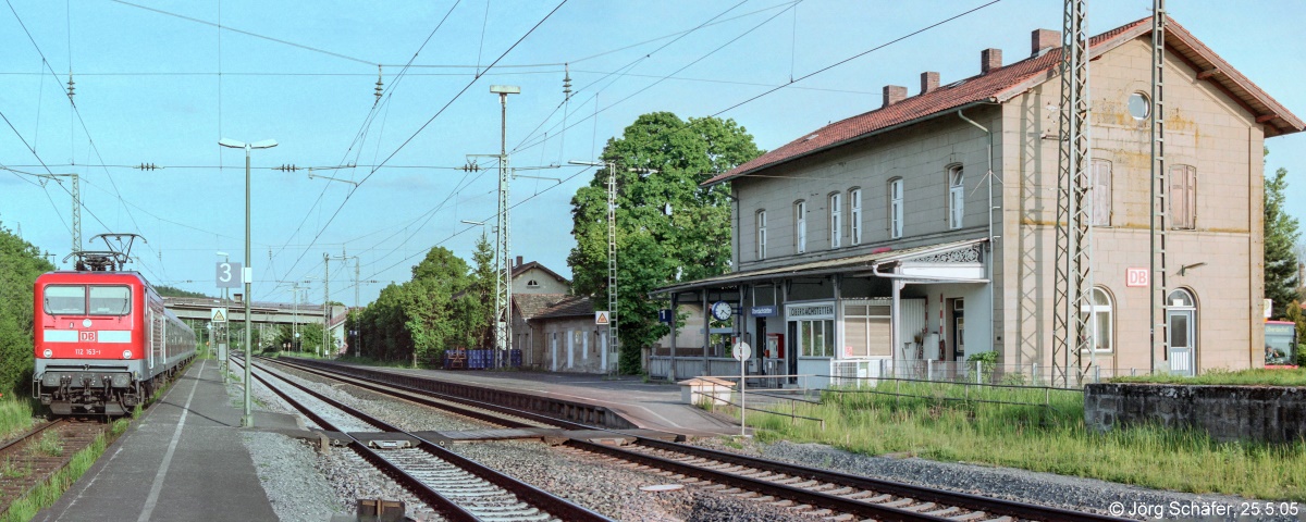 Interessant ist die Bahnsteiganordnung in Oberdachstetten: Der Zugang zu Gleis 1 liegt „ganz normal“ vor dem Empfangsgebäude. Züge nach Würzburg halten aber nicht auf Gleis 2, sondern auf dem Überholgleis 3. Dadurch können überhaupt keine anderen Züge fahren, wenn (wie am 25.5.05) die Fahrgäste über die Gleise 1 und 2 laufen müssen. Zuglok war 112 163. Jörg Schäfer