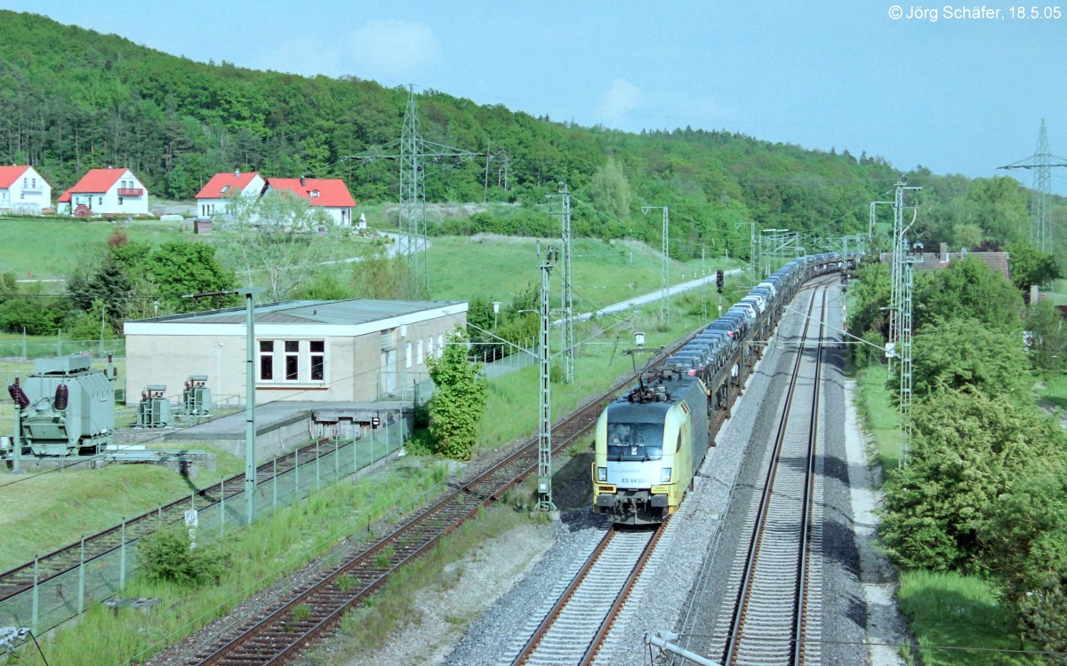 Oberdachstetten, Blick nach Osten über 143 866 vor dem DB-Umspannwerk am 18.5.05. Die Kleingärten am Gleis gehörten früher natürlich nur Eisenbahnern. Jörg Schäfer
