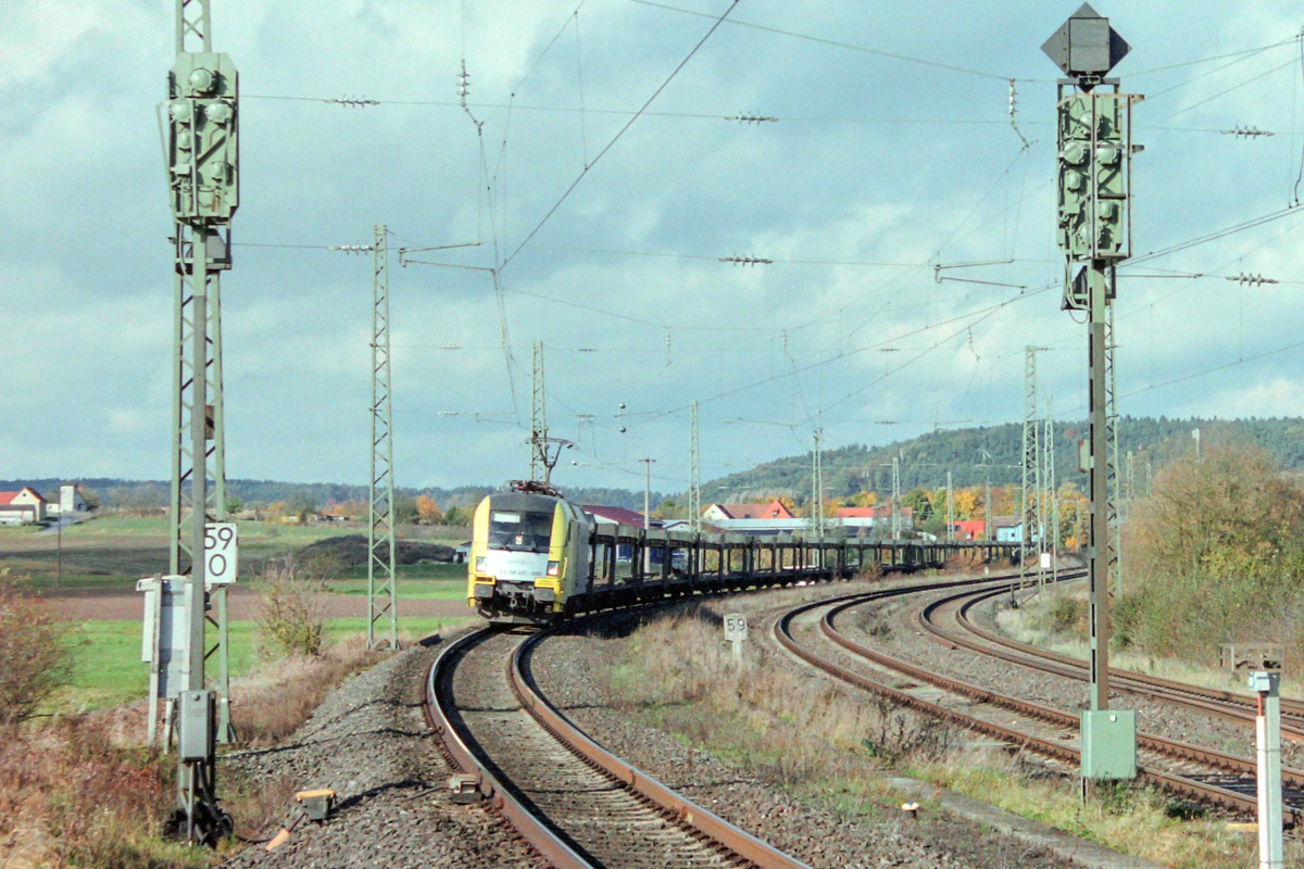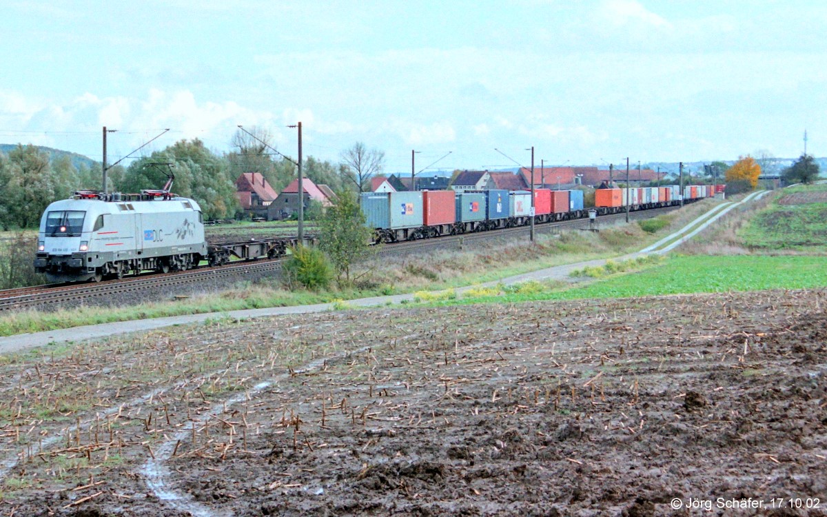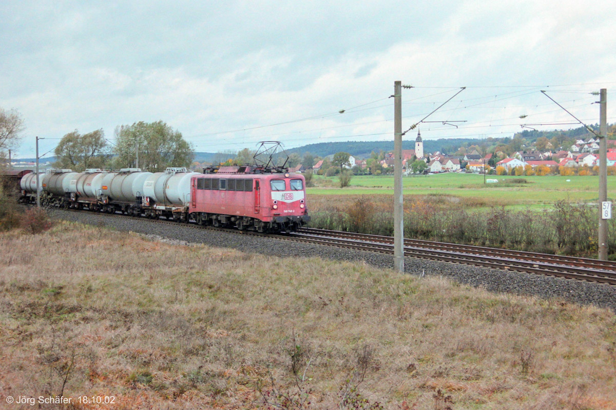 140 740 mit einem Güterzug südwestlich von Lehrberg bei km 57.8 am 18.10.02. Heute kreuzt im Hintergrund die Bundesstraße B 13 auf einer großen Brücke das Rezattal und die Bahnlinie. Jörg Schäfer