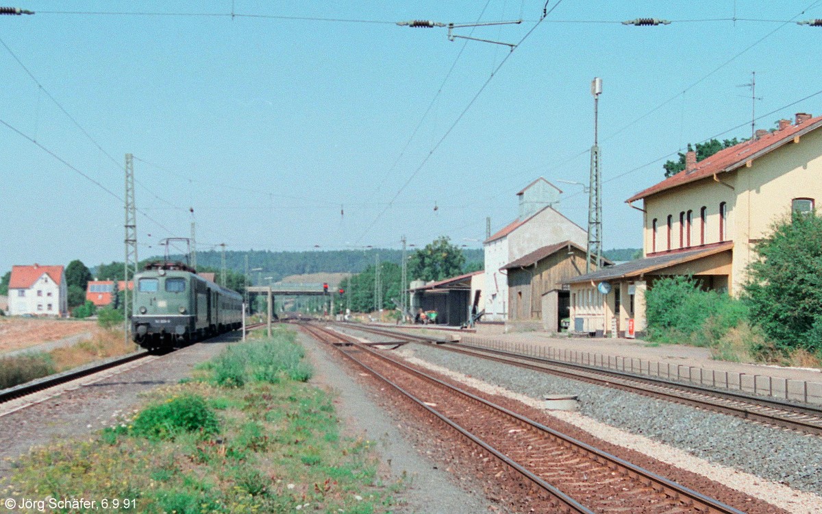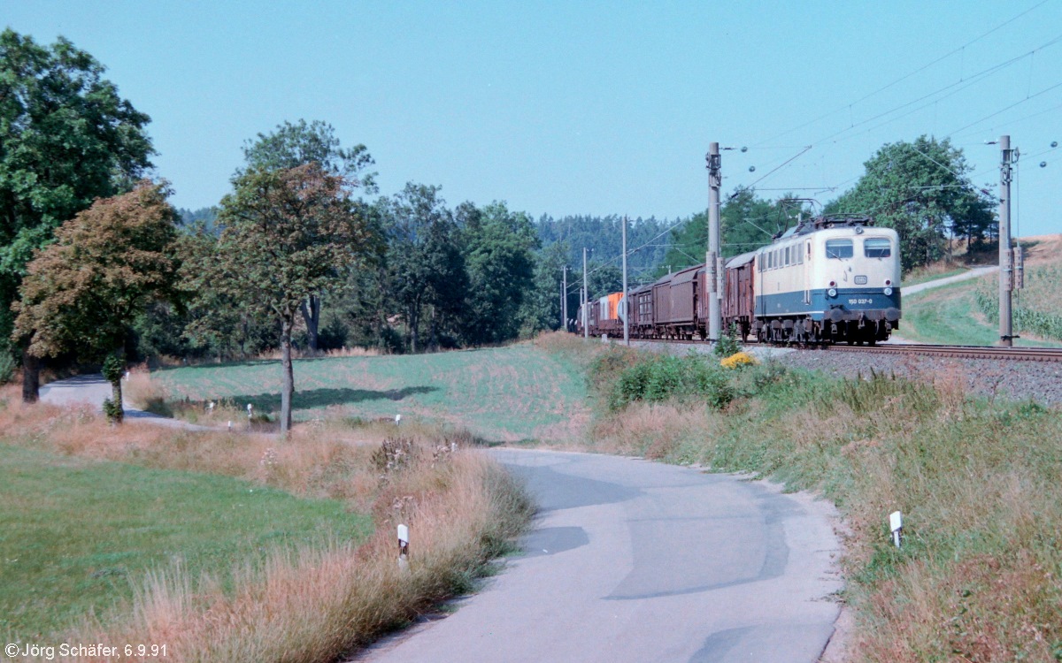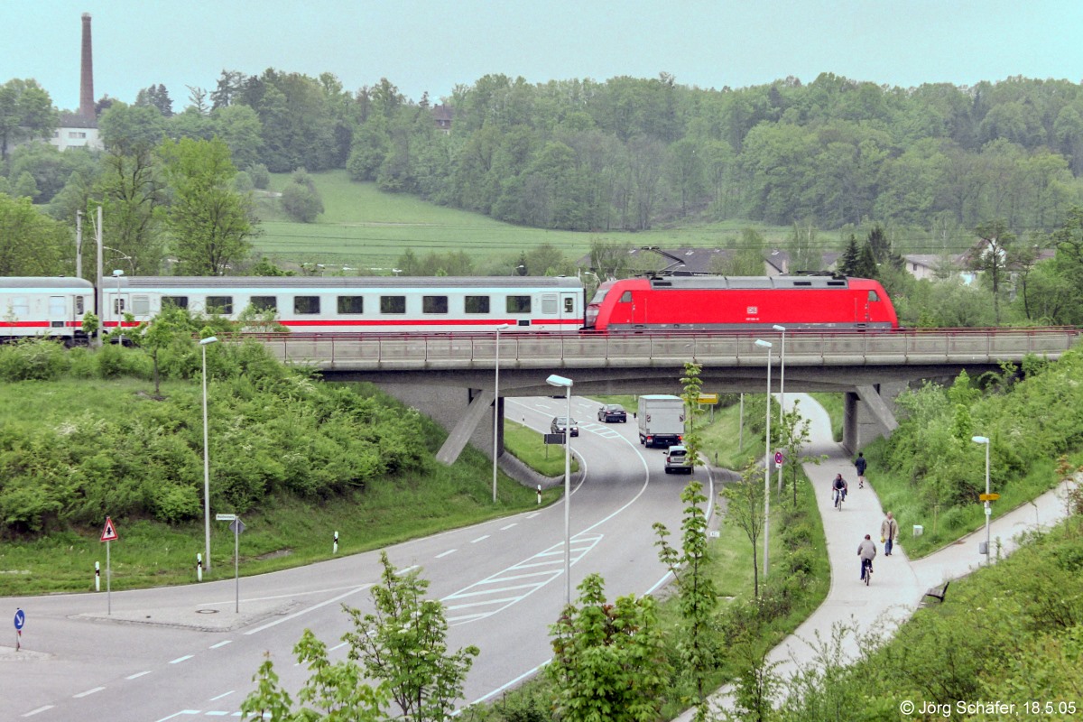 Den Bahnübergang am nördlichen Stadtrand von Ansbach, den 120 142 am 6.9.91 mit einem IC nach Würzburg passierte, gibt es nicht mehr. Mitte der 90er Jahre wurde die Ansbacher Westtangente eröffnet, die den KFZ-Verkehr unter den Bahnlinien nach Stuttgart und Würzburg kreuzungsfrei hindurch führt. Jörg Schäfer