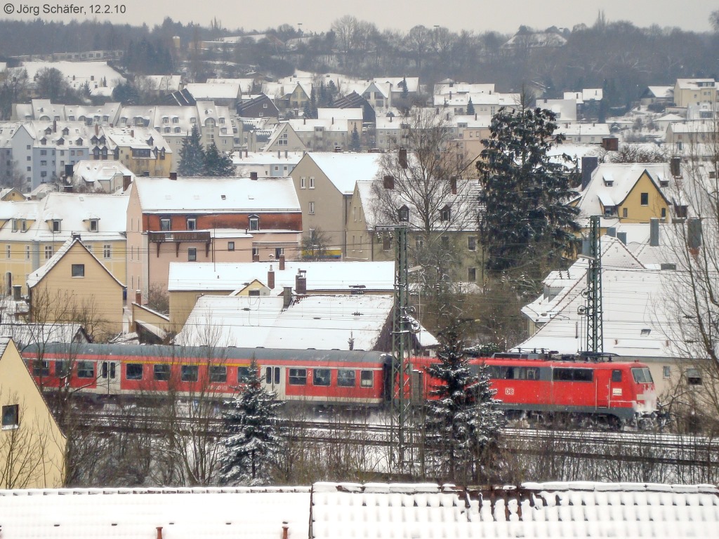 Blick über die Dächer von Ansbach auf einen RE nach Stuttgart am 12.2.10. Vor dem Zug sieht man das Gleispaar nach Würzburg, das dort nach Nordwesten abbiegt. Jörg Schäfer
