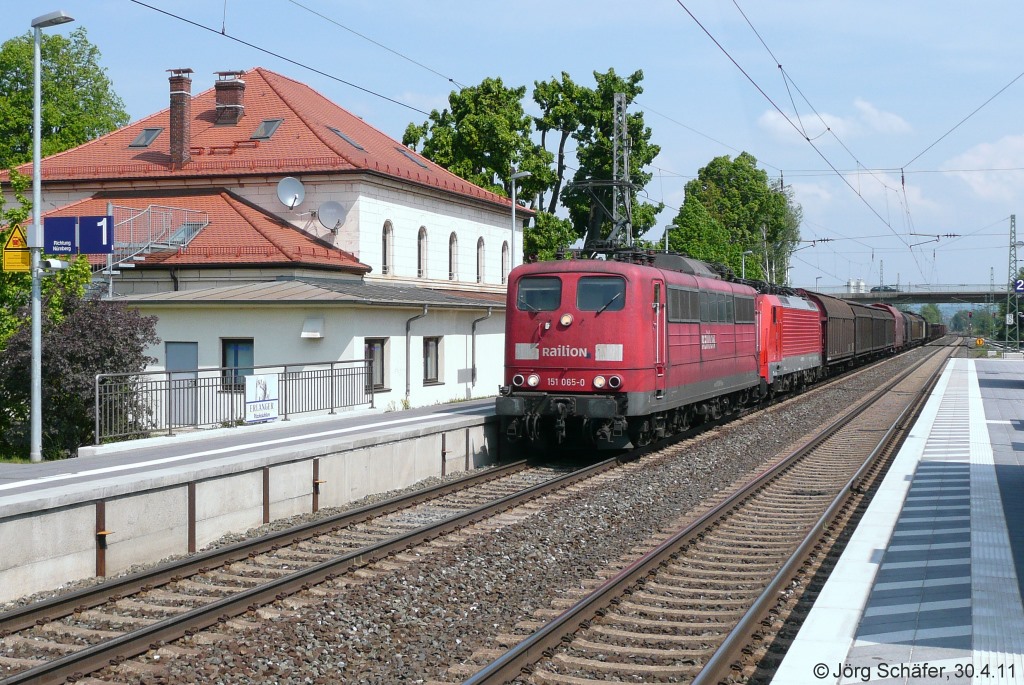 155 133 erreichte am 30.6.04 mit einem Güterzug nach Nürnberg den Bahnhof Hallstadt. Mitten im Weichenbereich lag damals noch ein beschrankter Bahnübergang, und der Fotograf stand hinter dem herunter gelassenen Schrankenbaum. Jörg Schäfer