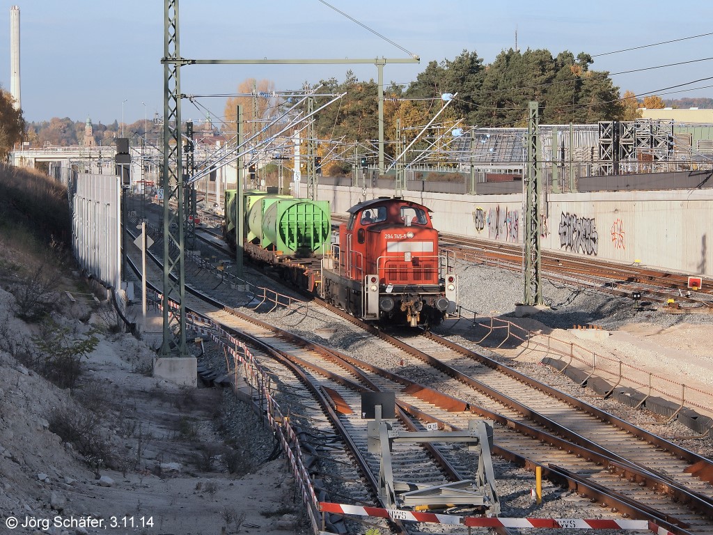 294 745 rangierte am 3.11.14 mit einem Güterzug in Erlangen zwischen dem Hauptbahnhof und Bruck. Die Strecke wird derzeit von zwei auf vier Gleise erweitert und wirkt wie eine einzige große Baustelle. Jörg Schäfer