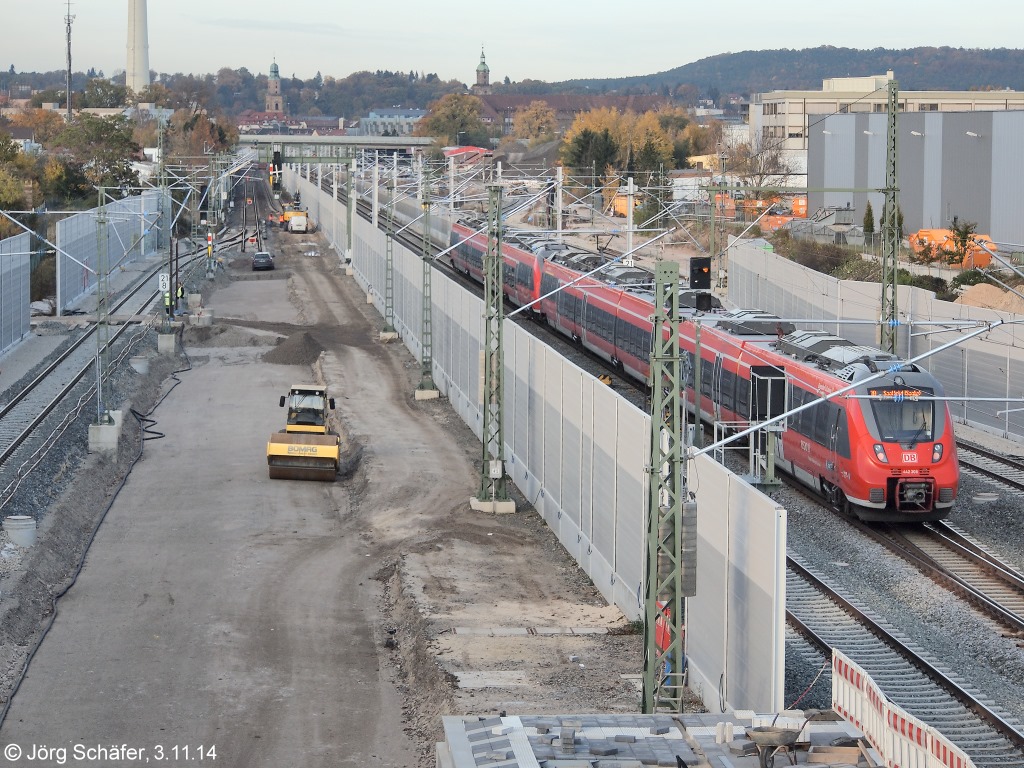 Am 3.11.14 wurde schon wieder in Erlangen gebaut, diesmal war Gleis 4 an der Reihe. Die Züge drängten sich daher auf den östlichen Gleisen und der neue Mittelbahnsteig bekam eine provisorische Verlängerung. Jörg Schäfer