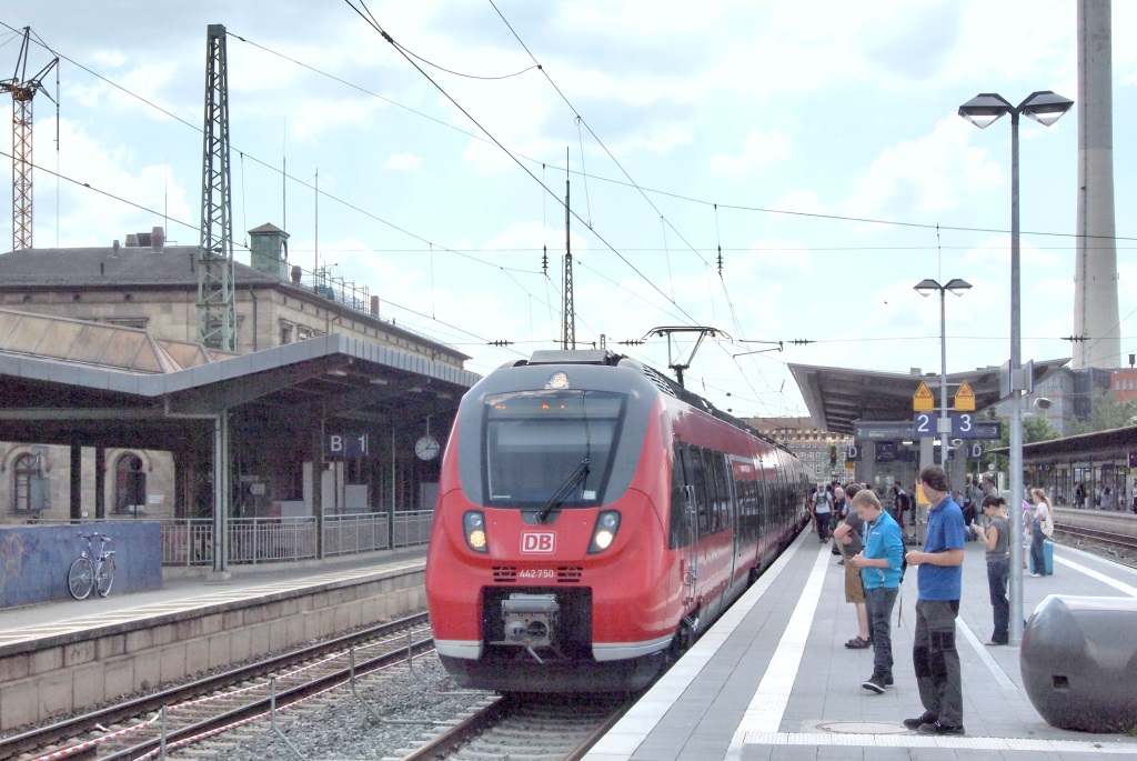 Seit 2010 gab es im Bahnhof Erlangen immer wieder Bauarbeiten mit Gleissperrungen. Am 9.6.12 wurde der Mittelbahnsteig zwischen Gleis 2 und 3 neu gebaut. 442 746 hielt daher auf dem Weg nach Nürnberg neben einer Baugrube. Jörg Schäfer