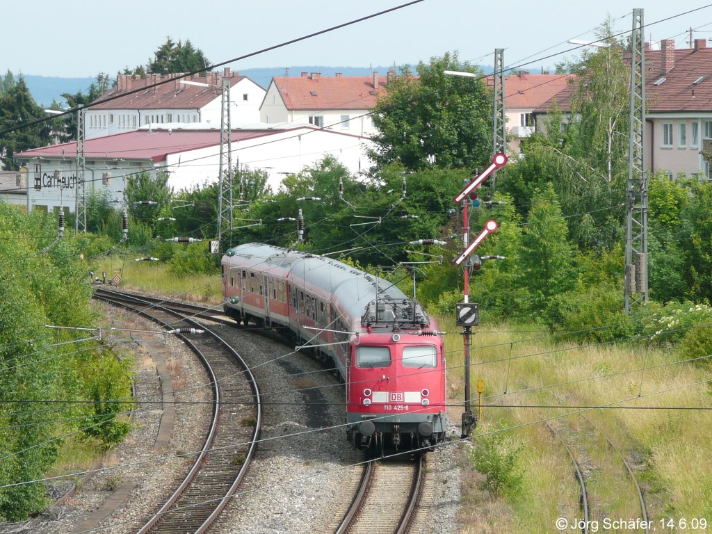 110 425 schob am 14.6.09 ihre RB in Nördlingen am Wärterstellwerk vorbei Richtung Donauwörth.