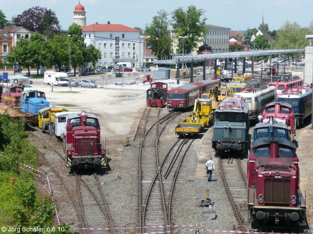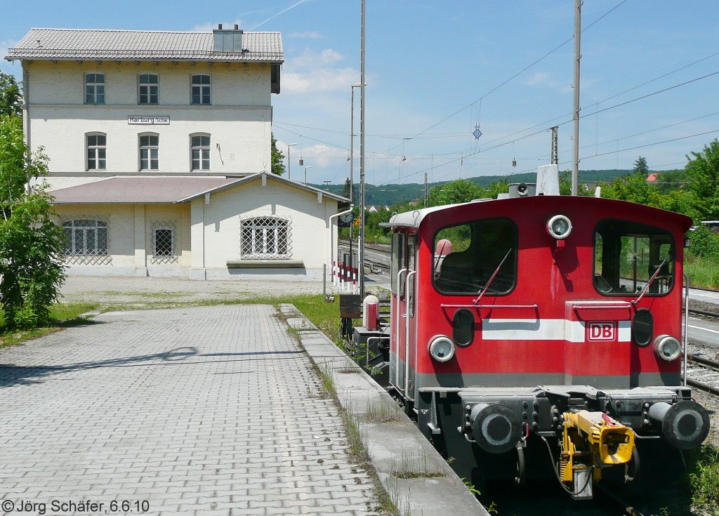 Detailaufnahme der Köf vor dem Empfangsgebäude in Harburg: Die 335 033 ist eine der letzten DB-Bahnhofsloks und wird für die Rangierarbeiten im angrenzenden Zementwerk benötigt. (Blick nach Norden am 6.6.10)