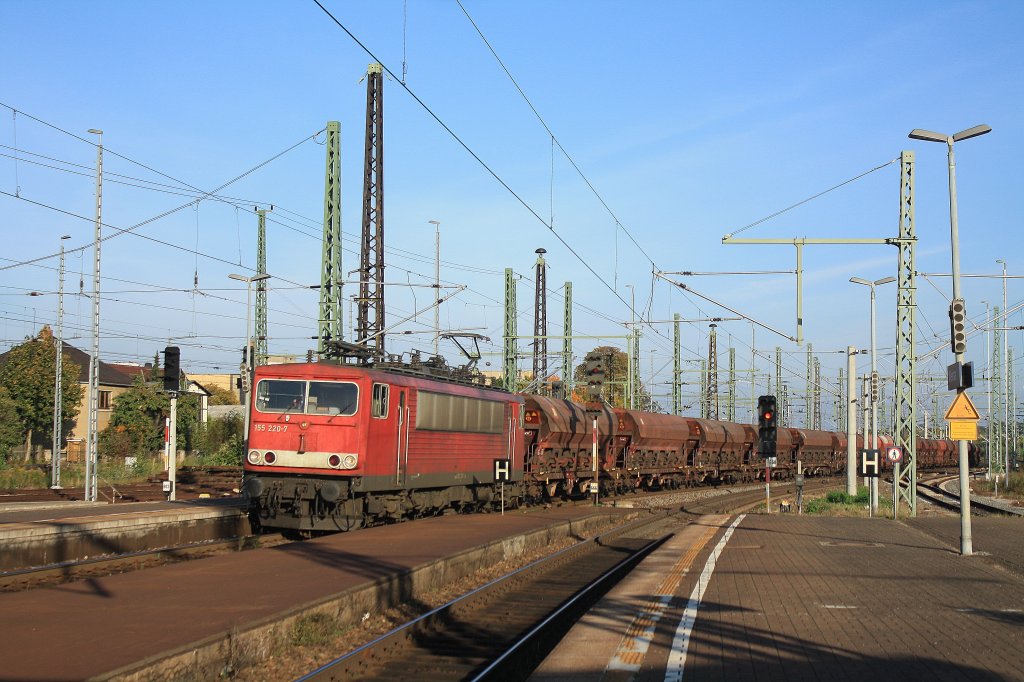 Am 28.09.2011 durchfährt 155 220 Weimar mit einem Zug bestehend aus 2Achs. und 4Achs. Selbstentladewagen.