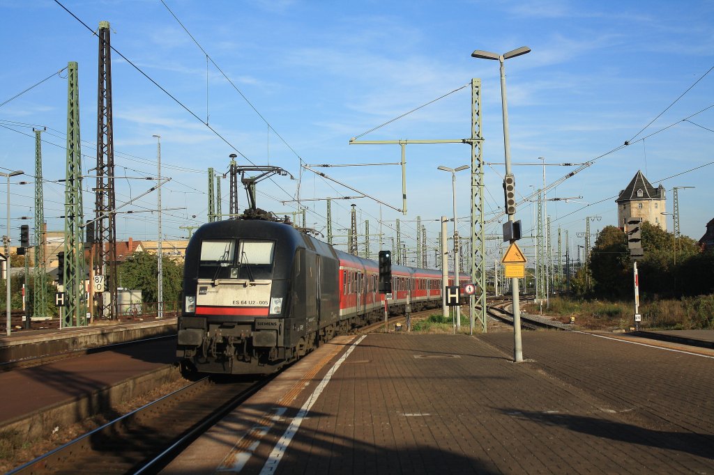 ES 64 U2 - 013 verlässt am 28.09.2011 den "Kultur Bahnhof Weimar" als Zuglok einer Regionalbahn nach Eisenach.