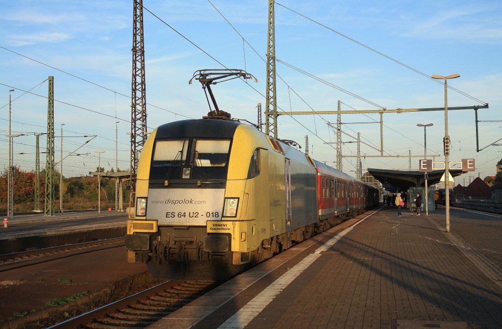 ES 64 U2 018 erreicht am 29.09.2011 den  Kultur Bahnhof Weimar  als Schublok einer Regionalbahn nach Halle.